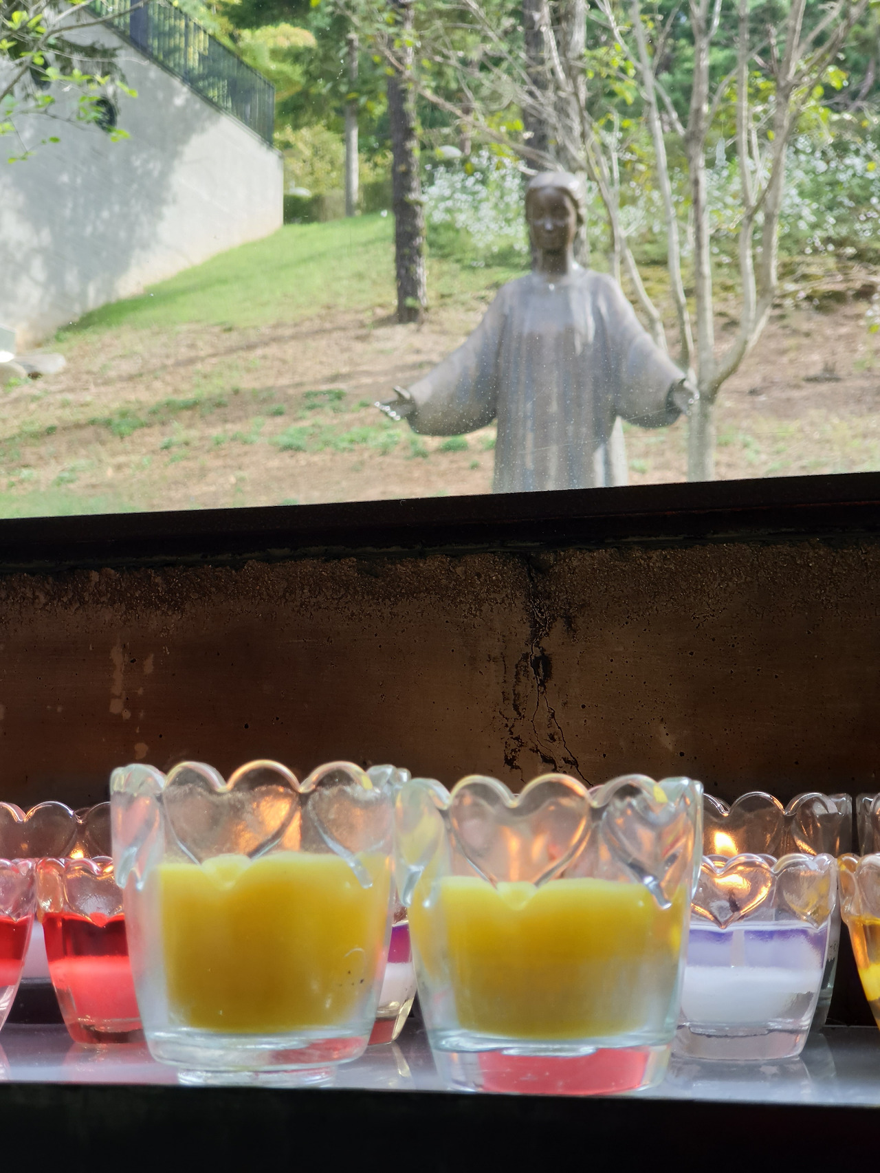초봉헌소는 종교적인 공간과 사회적인 공간이 공존하는 성지의 분기점에 자리한다. 성지의 자연환경 자체를 하나의 성당으로 바라본 건축가 한만원은 초봉헌소가 주변환경에 열려있도록 유리로 마감했다. 성모상 역시 건물뒤편, 창너머 외부에 두어 순례자들이 초를 봉헌하면서 바깥쪽에 놓인 성모상을 바라보도록 했다.