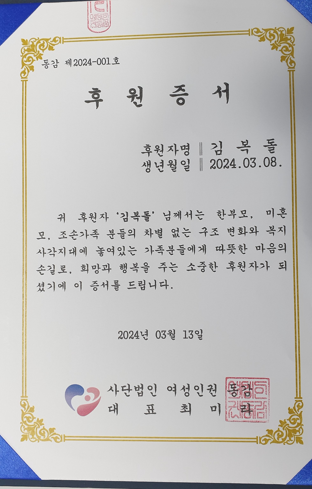 2043년 5월 19일 월요일(2024년 출생자의 성인식)까지 복돌이에 대한 끊임없는 관심을 내빈에게 부탁하고, 부모는 책임감을 다시 확인하는 시간이 되며, 복돌이에게는 먼 훗날 좋은 추억이 될 파티. 복돌이 성인이 될 때까지 매 순간을 소중하게 여기는 보물상자가 되길 바라는 내 마음도 꾹꾹 눌러 담았다..
