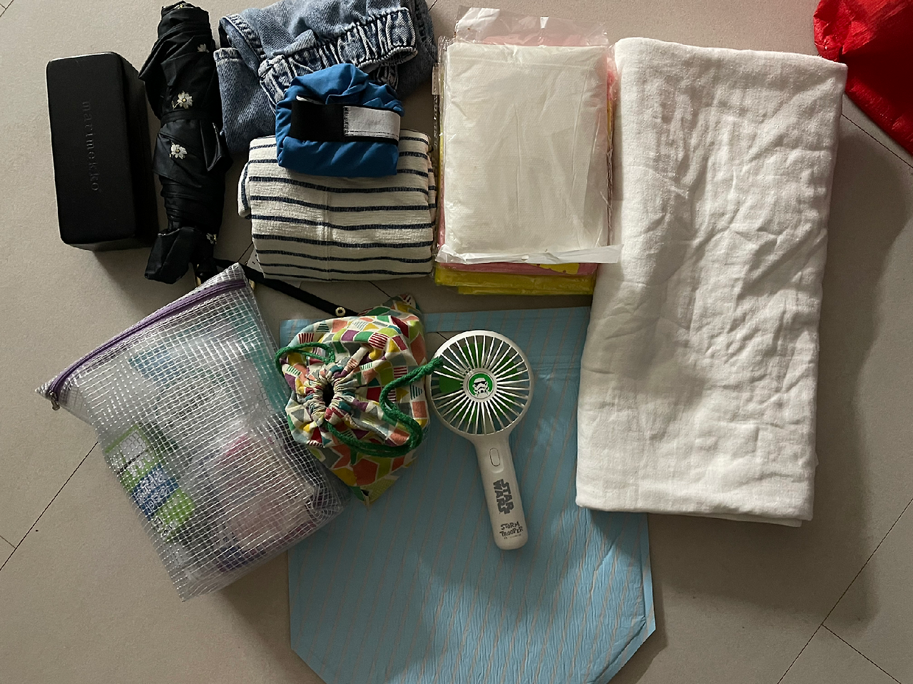 밤밤쇼를 시작한 요즘은 큰 수건, 여벌 옷, 더우니까 선글라스, 양산, 얼음물 등.