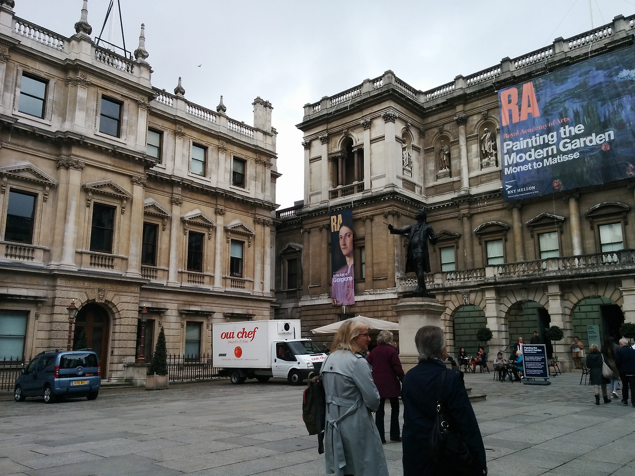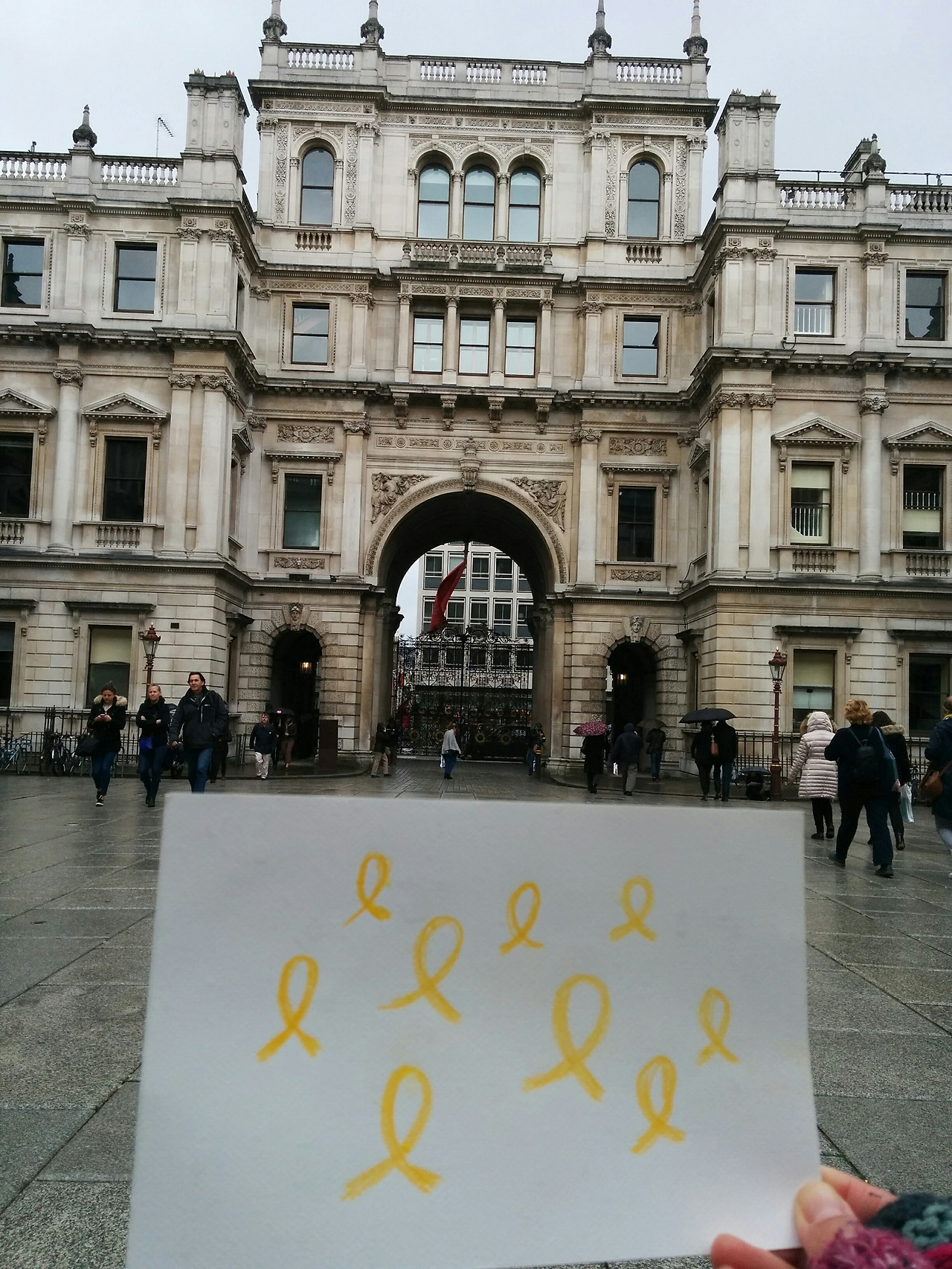 이곳 벌링턴하우스(Burlington House)에는 영국왕립미술원(RA, Royal Academy of Arts)이 있다. 다들 이 건물의 안마당 여기저기에 자리를 잡았다. 나도 가운데 조각상 아랫단에 걸터앉아 피카딜리 대로가 내다보이는 곳을 향해 그림을 그리기 시작했다. 내내 흐리고 습기가 가득하더니 자리를 잡고 앉자마자 비가 오기 시작했다. 우산을 꺼내어 왼쪽 어깨에 끼우고 계속 그림을 그렸다. 흐얼. 춥다. 너무 춥다. 장갑도 꼈지만 손도 얼고, 숙소에 두고 나온 핫팩이 계속 생각났다. 추울 때 사용하라고 친구가 챙겨준 것이었는데. 흑.