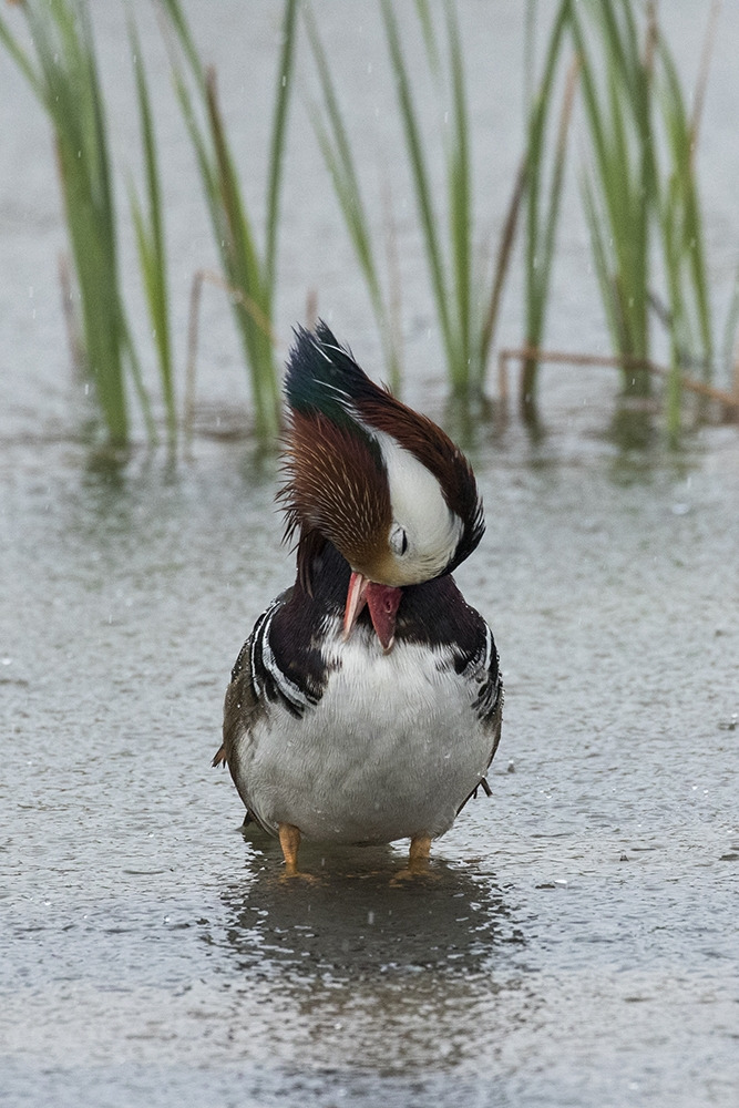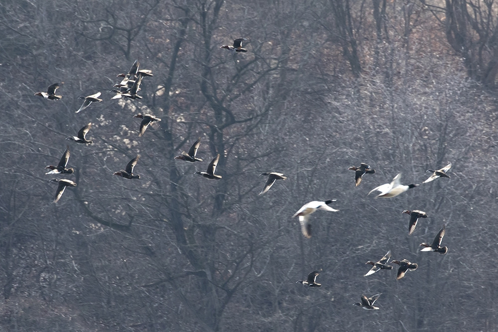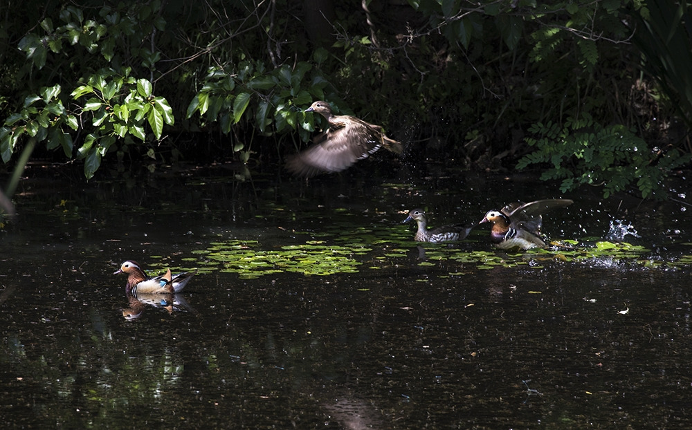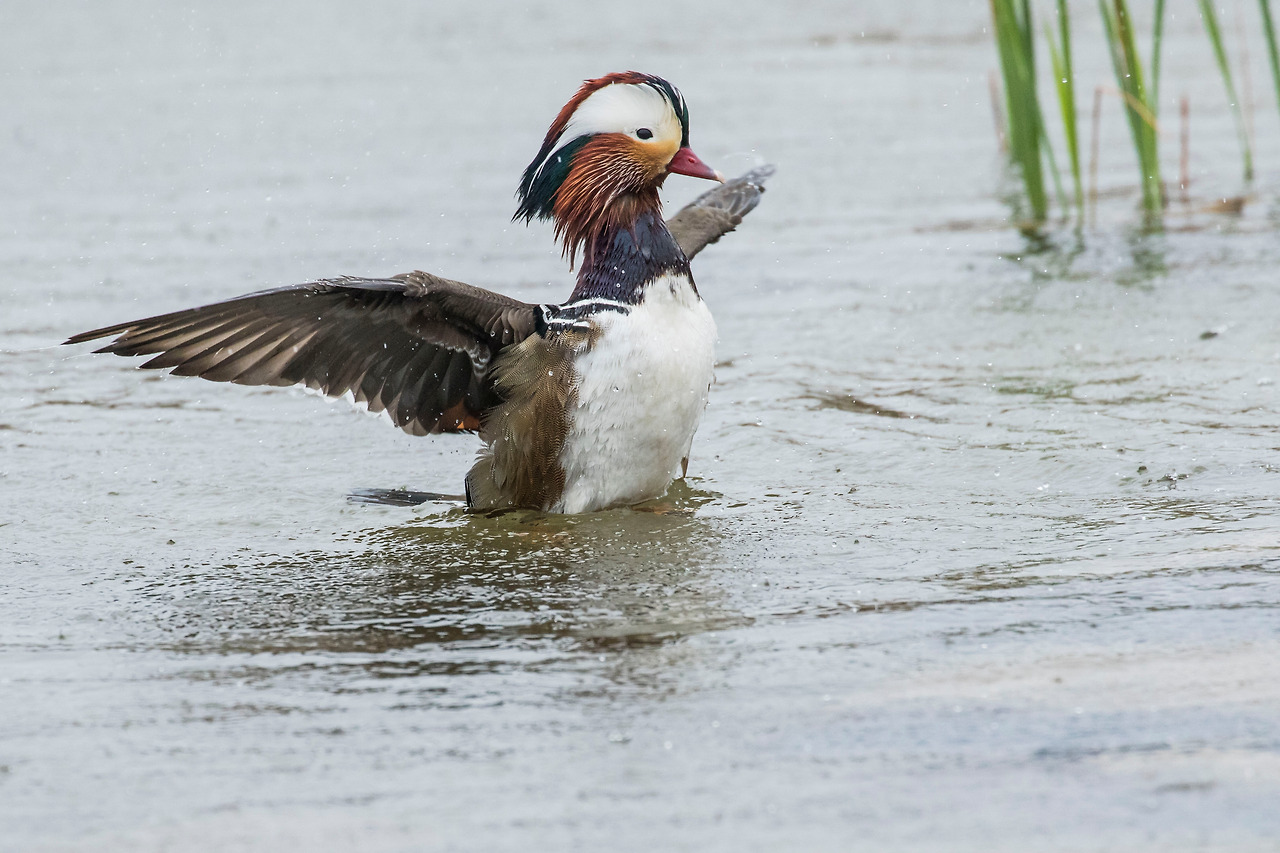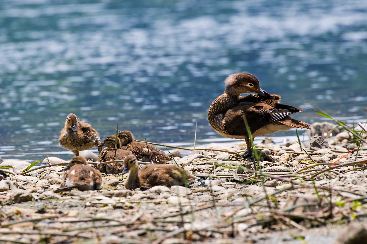 첫 번째로 소개할 것은 원앙이다. 강변을 오가면서 원앙을 내 집 앞에서 내 눈으로 볼 수 있다는 사실은 엄청난 놀라움이었다. 아니 늘 볼 수 있는 것을 이제야 알았다는 것이 부끄러울 정도였다. 어느 해 늦은 봄날 아침 가는 비가 뿌리고 있었는데 얕은 인공수로 한쪽에 원앙 한 쌍이 보였다. 그들은 내가 가까이서 보는 것도 아랑곳없이 몸단장을 하고 있었다. 내가 그렇게 가까이서 원앙을 본 것은 그것이 처음이었다. 녀석들은 물속에서 날개를 퍼득거리고 부리로 온 몸을 훑어가며 날개를 씻고 있었는데 가늘게 내리는 빗줄기를 즐기고 있는 듯했다. 그 날 이후 원앙은 내게 무척 친숙한 길동무가 되었다.