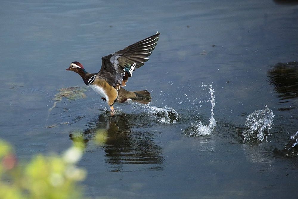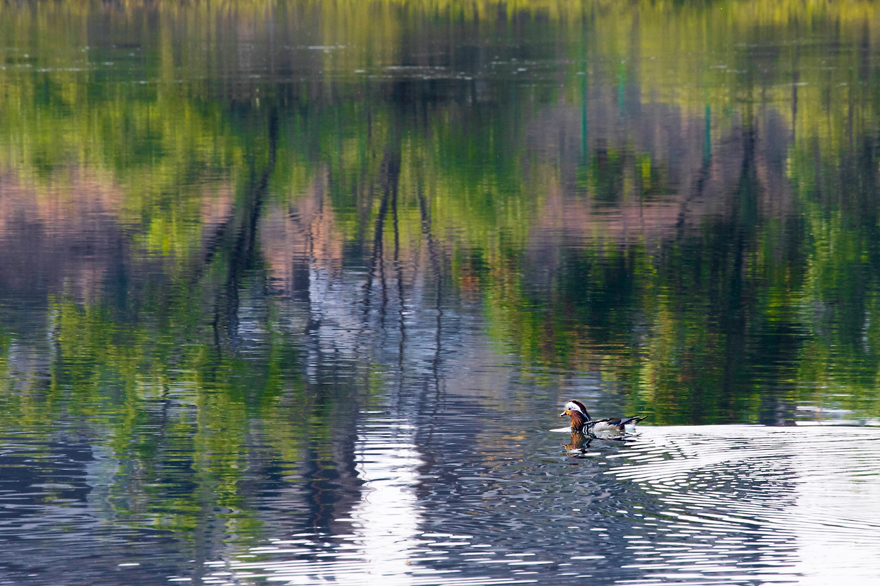봄날 신록을 즐기는 원앙 한 마리가 그림 한 폭을 만들었다.