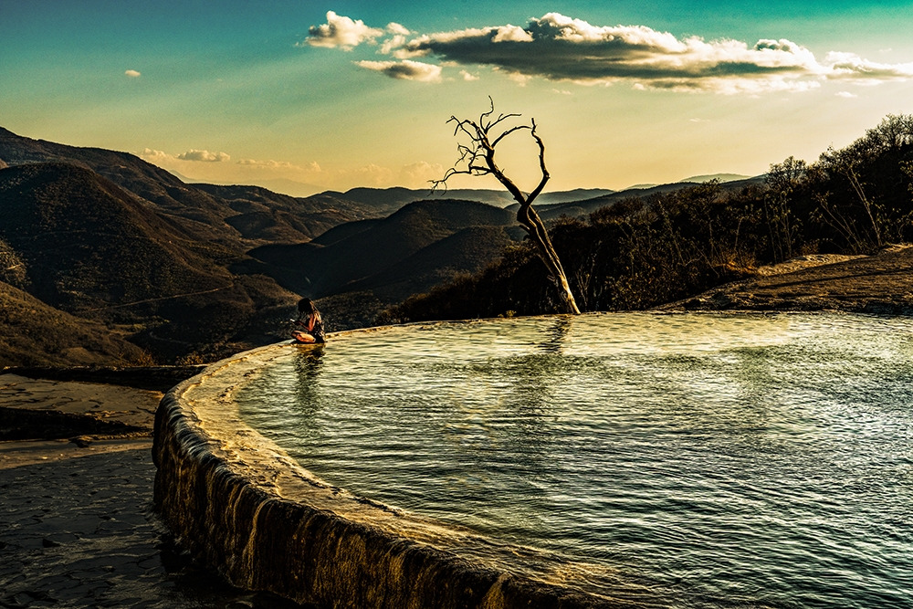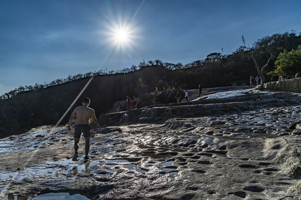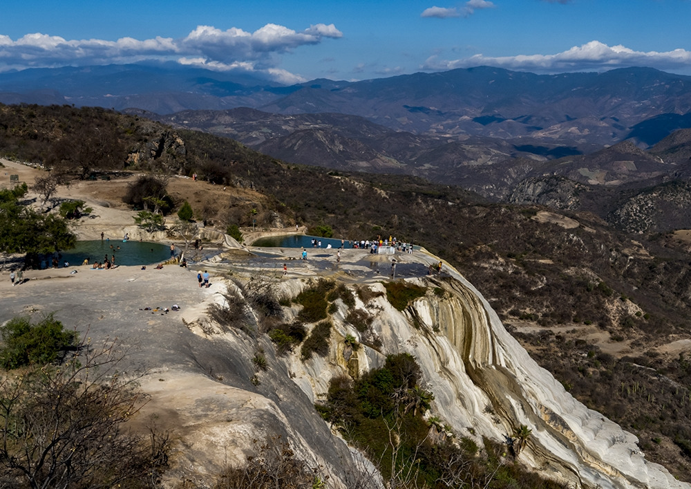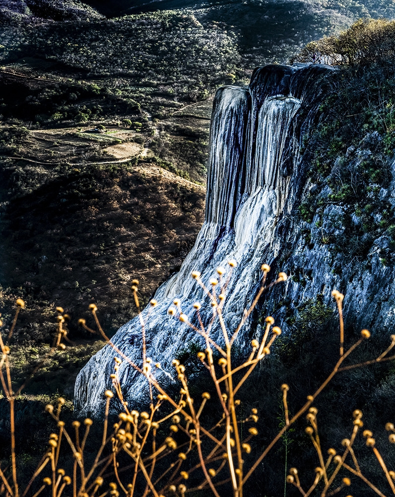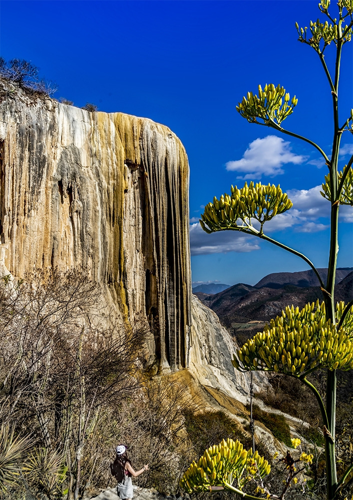 그렇게 만들어진 폭포가 이에르베 엘 아구아(Hierve el Agua), 우리말로 하면 끓는 물 폭포이다. 끓는 물이란 이름은 바위틈에서 솟아나는 샘을 가리키는 말에서 온 것이다. 높이 90미터와 60미터의 두 흰색 바위 폭포는 멀리서 보면 실제 물이 흰 포말을 일으키며 쏟아져 내리는 듯 보이거나 또는 한 겨울의 얼어붙은 폭포처럼 보인다. 물에 녹은 석회암의 흰색으로 인해 폭포는 소금 폭포라는 이름도 가지고 있다.