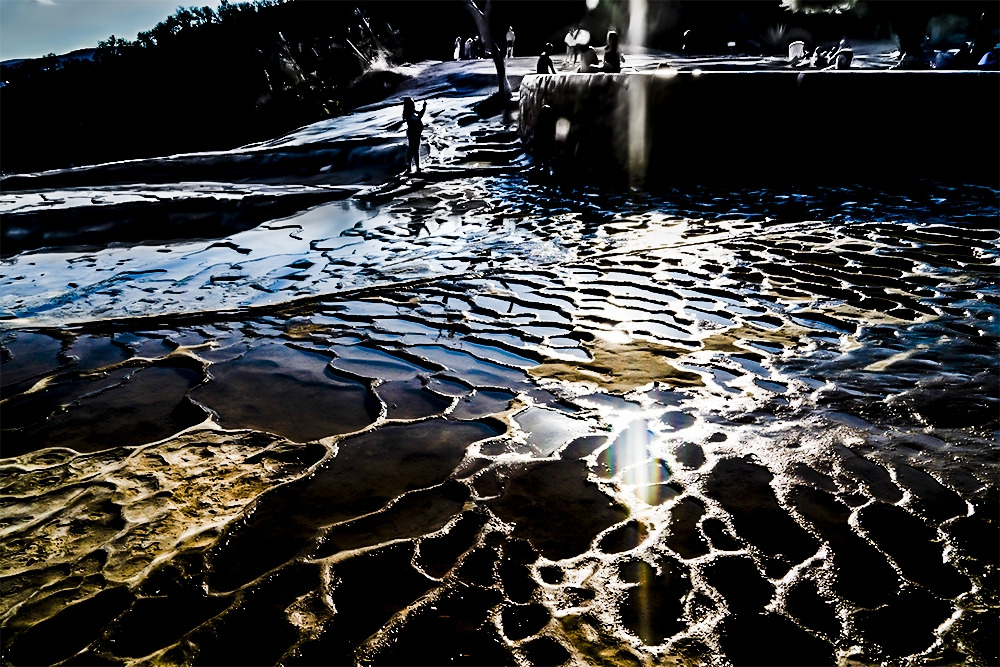 절벽 바로 위에 만든 인공 풀장이다. 인공의 풀장 벽에도 석회석이 녹아 흐른다.