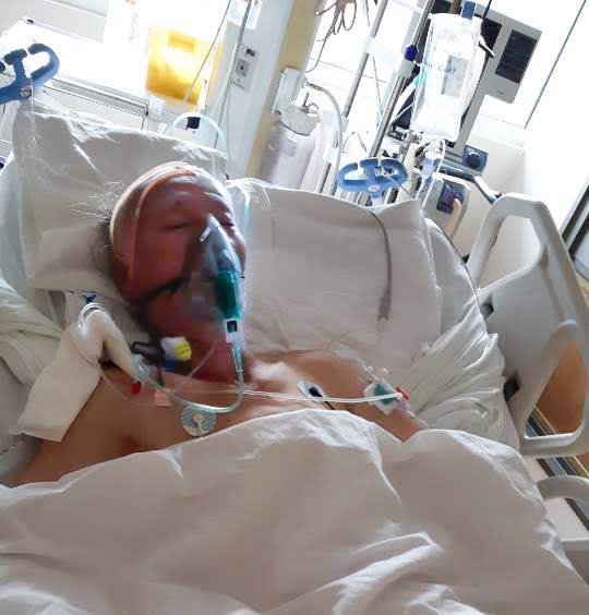 수술 후 중환자실에 누워 있는 필자. 산티아고의 한국영사관 박준이 영사실무관이 내 상태를 살피며 촬영한 것이다.