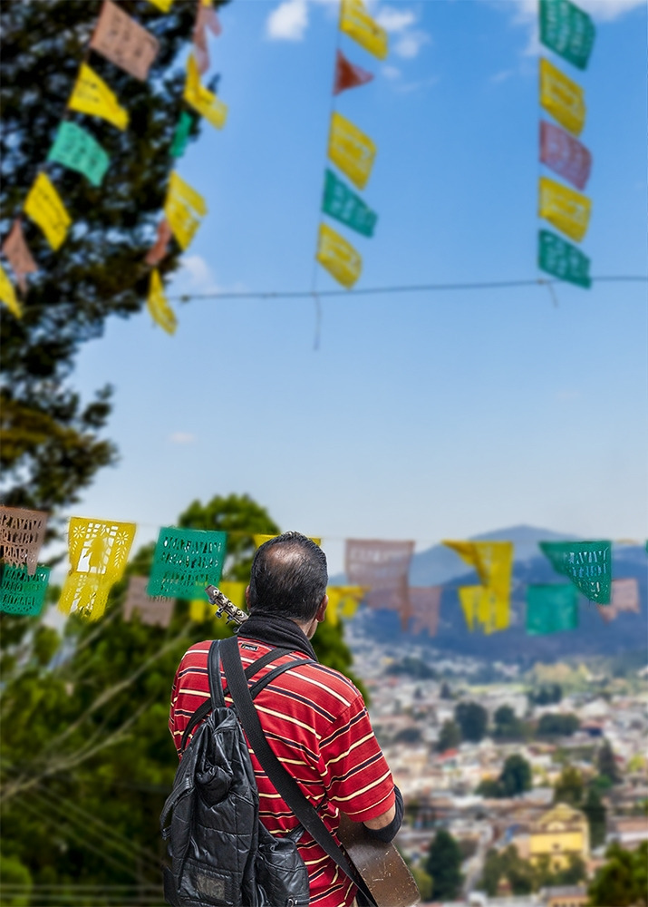 한 여행자가 산 크리스토발 성당 앞에서 시내를 내려다보며 기타를 치고 있다.