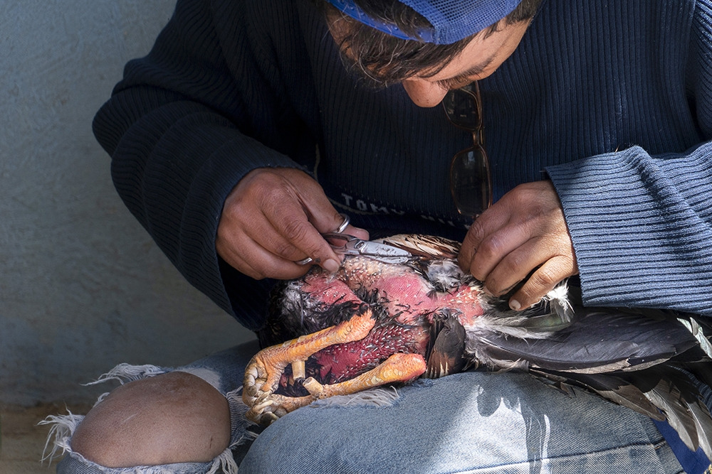 성당 뒤에서 한 남자가 닭을 손질하고 있다. 닭은 신에게 바치는 중요한 제물의 하나이다.