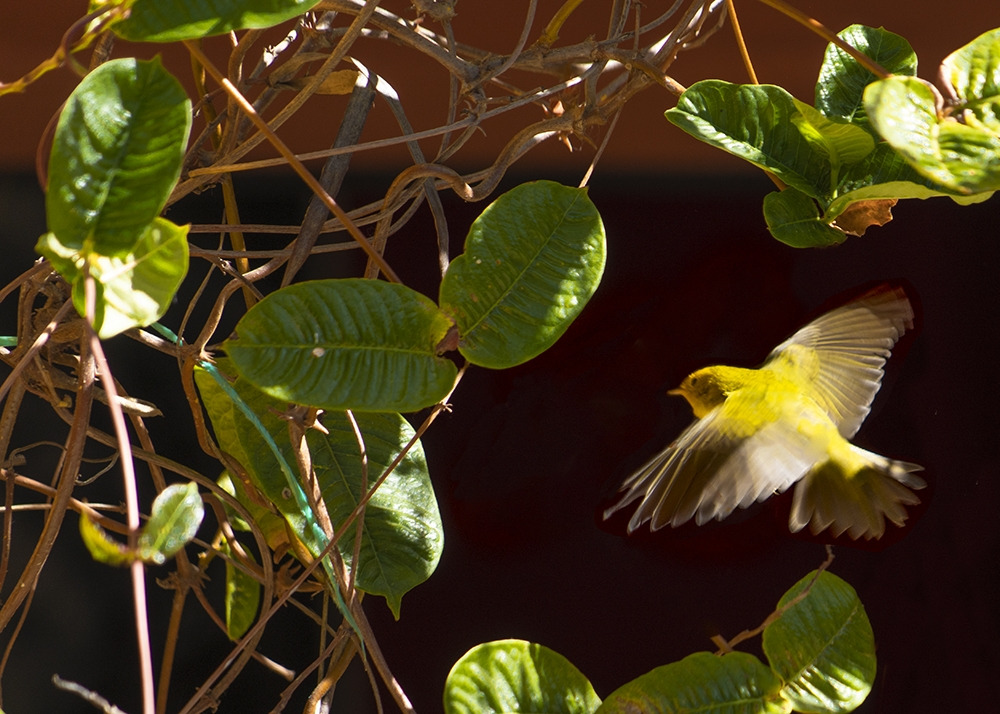 문안으로 들여다 보이는 까사 노 볼롬과 정원을 날아다니는 노란 새.