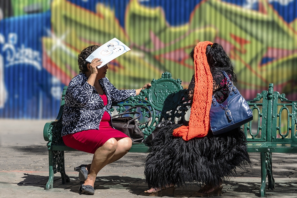 소칼로 광장 한쪽의 시청시 밑 회랑에 아침 햇볕이 들어온다. 광장에 간식거리를 팔러 나온 여성이 물건을 내려놓고 땀을 식힌다.