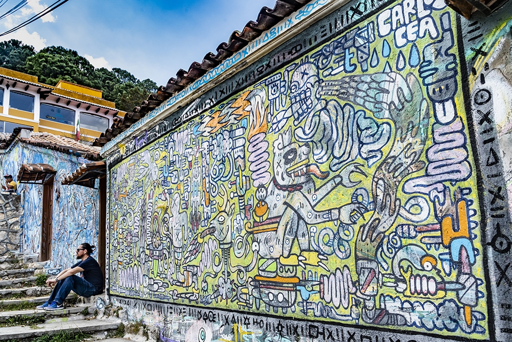 길고 긴 계단을 올라 마주한 산 크리스토발 교회는 이름값에 비해 초라하게 보였다. 올라가는 계단 양쪽의 울창한 숲이 오히려 더 인상적이었다. 또 언덕 아래의 마을에서 본 벽화는 요란한 원색을 피하고 빨강 파랑 노랑의 삼원색에서 한 계단씩 내려온 주황색 청록색 연두색의 부드럽고 따뜻한 조화를 이루고 있었는데 벽면 가득히 채워진 기이한 형태의 그림과 글씨들이 보는 이를 묘하게 끌어들였다.