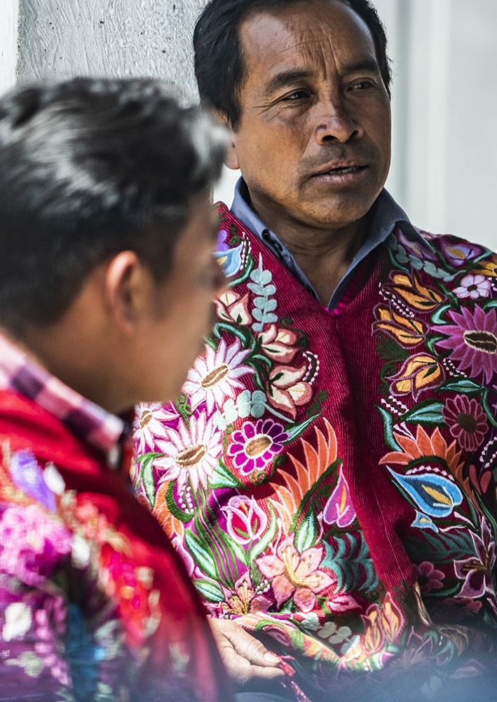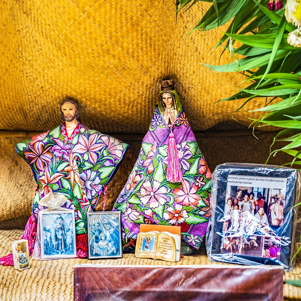마을 안의 직물 짜는 집에 들어갔을 때 인상적인 것은 베틀 위에서 직물을 짜는 사람보다 그 뒤에 있는 종교적 성물들이었다. 한쪽에는 장미와 국화 등의 꽃 장식 앞에 양으로 보이는 세 마리 동물과 함께 옥수수가 놓여 있었다. 옥수수는 흰색, 보라색, 노란색, 검은색의 네 가지 색으로 십자형으로 놓였는데 그들의 옷 색깔과 예쁘게 조화를 이루고 있었다.