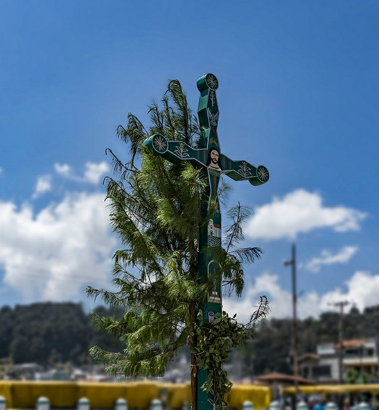 산 후안 성당과 성당 앞의 소나무 십자가. 양털 망토의 남자는 자치 경찰이라고 한다.