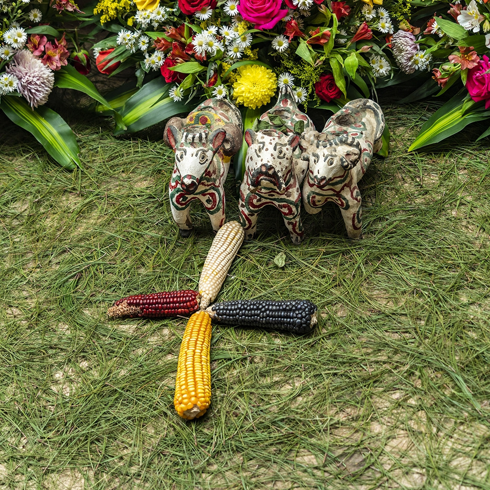토착민의 신성성을 상징하는 솔잎 위의 옥수수