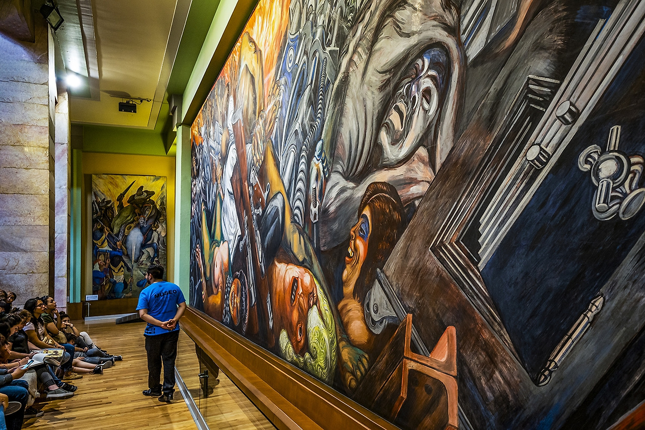 큰 길이건 작은 골목이건 벽화가 그려지지 않은 곳은 없다. 왼쪽은 국립예술궁전에 걸린 근대 멕시코를 대표하는 화가의 한 사람인 오로스꼬의 카타르시스라는 작품이다.