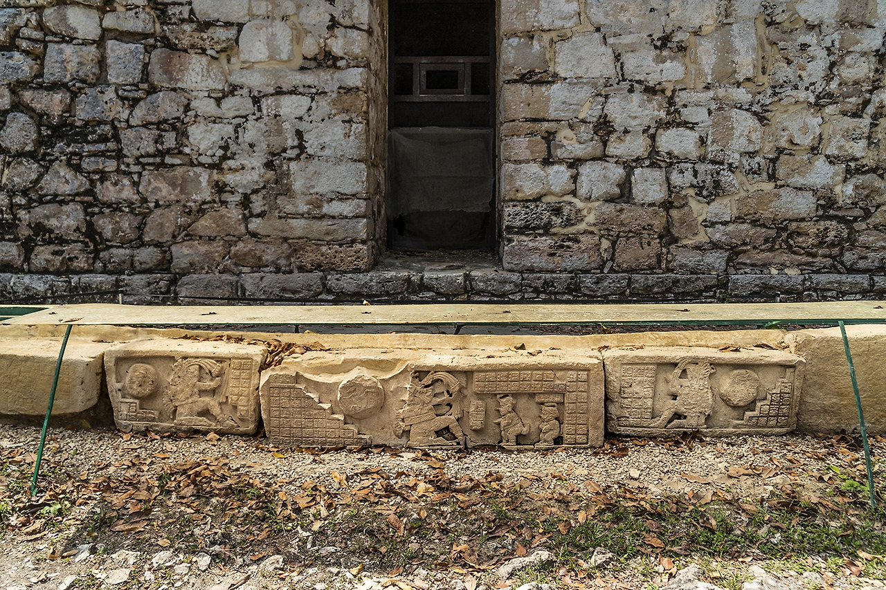 건물의 기단부 앞에 1단으로 계단석처럼 돌을 깔아 마치 지대석처럼 보이는데 이 돌들의 정면에 흥미로운 조각상들이 있다. 상형문자 계단(Hieroglyphic Stairway)이라고 부르는 이 계단석에는 구기 경기를 하는 것으로 보이는 조각상들이 있다. 구기 경기장은 멕시코에 온 이후 마야 유적지마다 볼 수 있었지만 막상 현장에서 경기가 어떻게 치러지는지를 알 수 있는 자료는 볼 수 없었다.