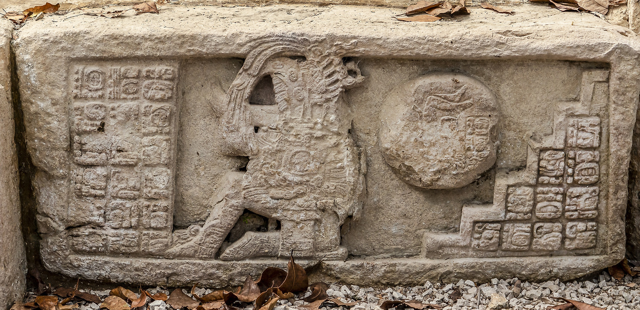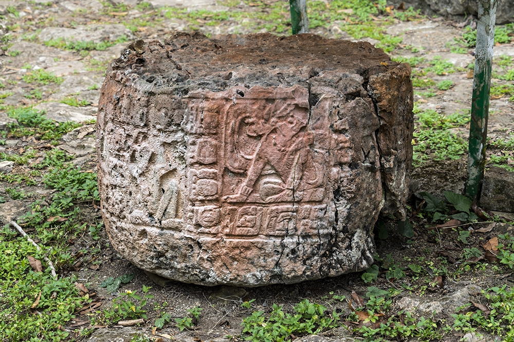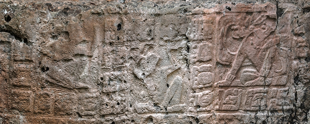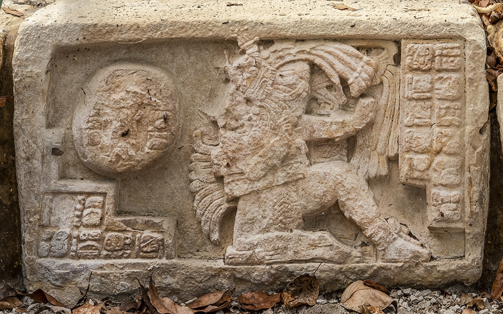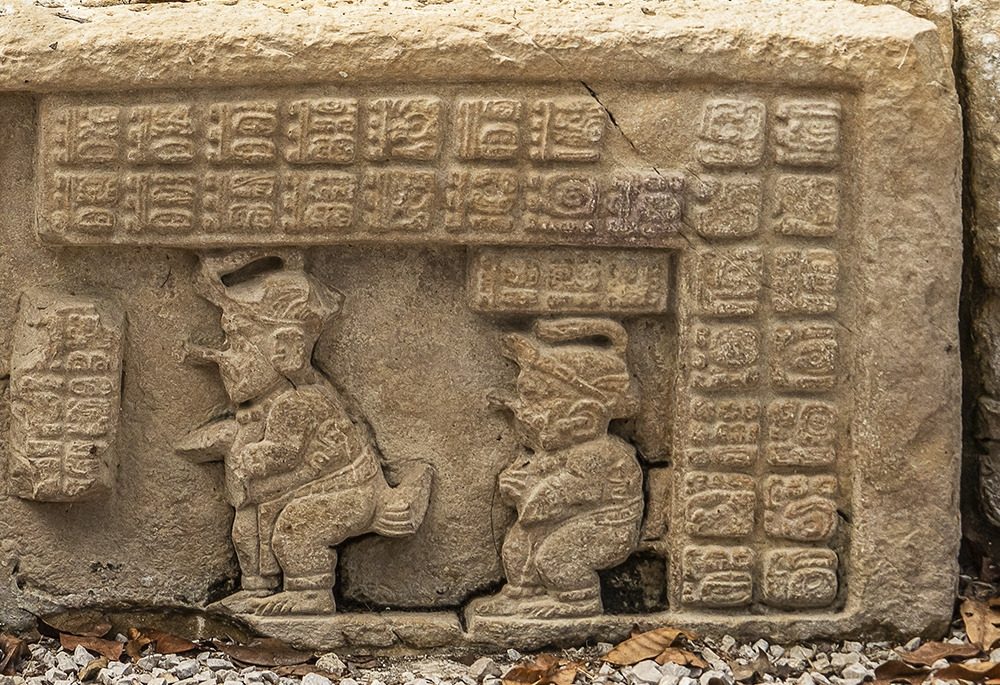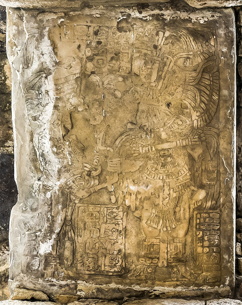 빠하로 하구아르 4세의 상을 새긴 42호 상인방. 왕의 앞에 신하 한 사람이 서 있고 왕의 뒤쪽과 신하와의 사이에 문자가 새겨진 새겨진 것이 보인다.