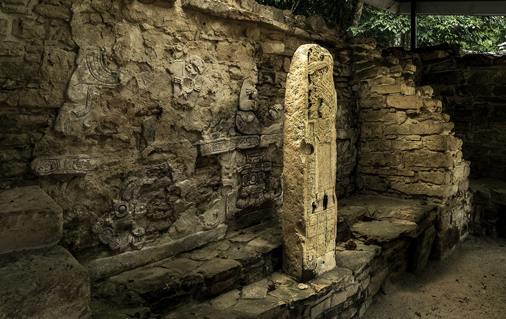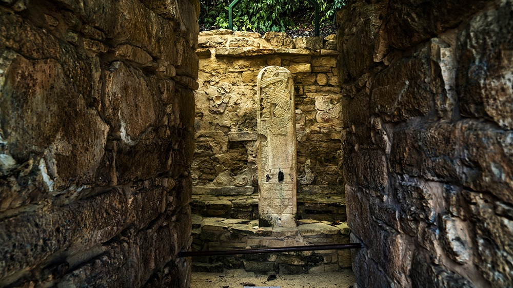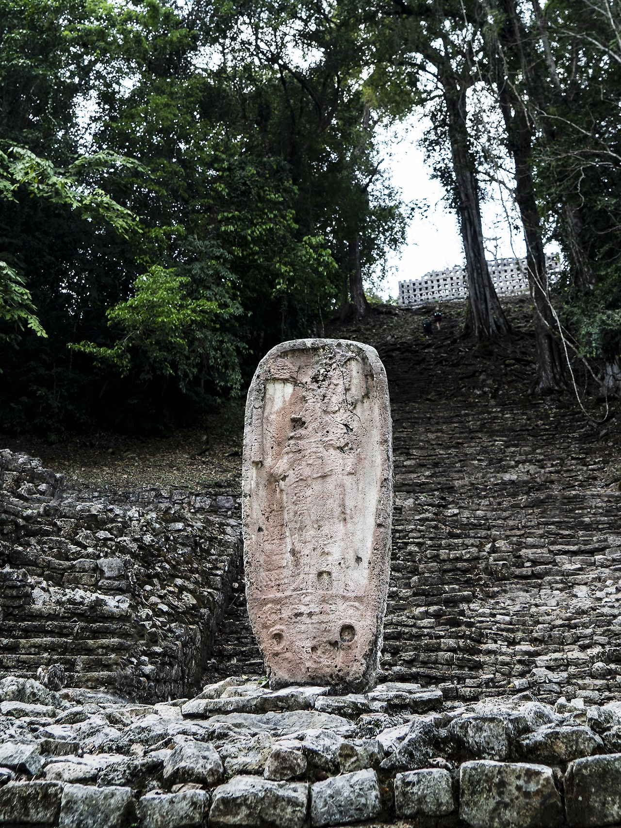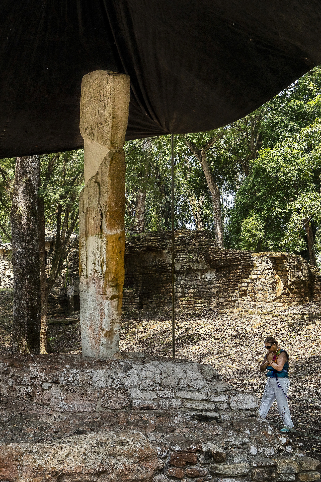 1호 비석. 전성기의 야시칠란을 통치한 빠하로 하구아르 4세의 기념비. 여행객으로 보이는 한 여성이 비석 앞에서 두 손을 모으고 기도하고 있다.