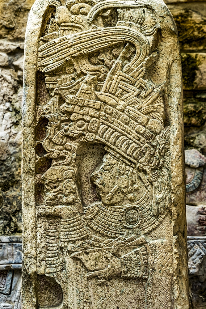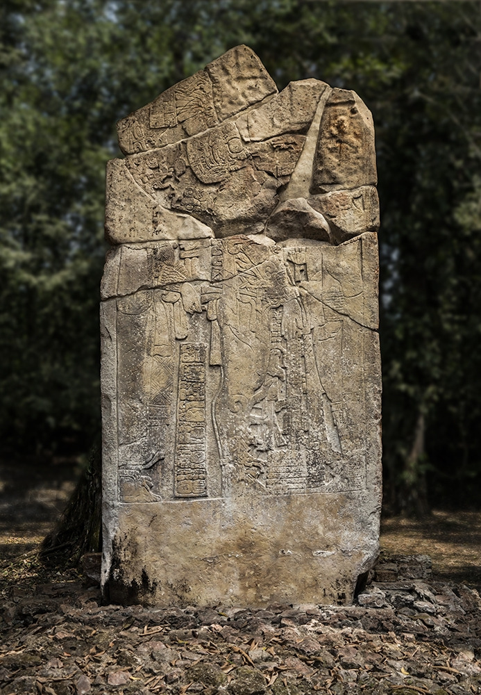 비석 뒤에는 많은 그림과 글씨들이 새겨진 벽면이 있어 비석의 주인공을 호위하고 있는 듯 보인다. 오른쪽은 비석 정면으로 빠하로 하구아르 4세의 어머니 상이다.