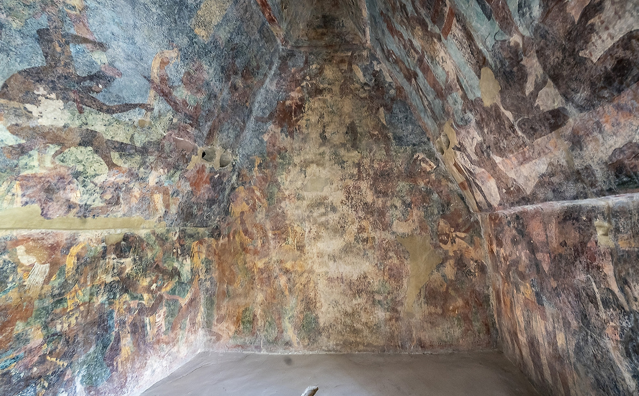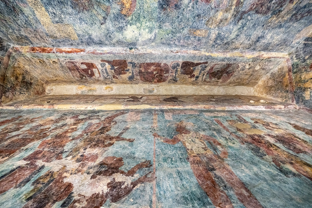 그림들은 세 개의 방에 나뉘어 있다. 방으로 들어가는 출입문 위의 상인방에는 야시칠란에서 본 것처럼 왕과 관련된 그림과 글씨들이 새겨져 있다. 이 상인방의 그림에는 아직도 마야의 청색이라고 부르는 푸른색의 물감이 남아 았어 본래는 선명하게 채색이 되어 있었음을 보여준다. 또 출입문의 양쪽 벽에도 프레스코 벽화의 흔적들이 남아 있다.