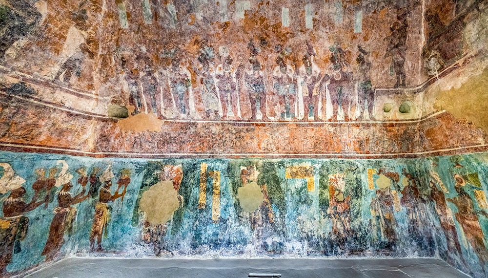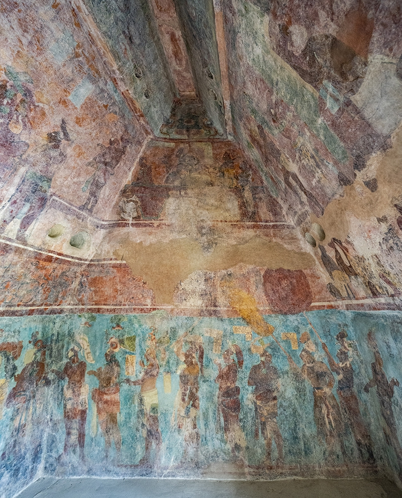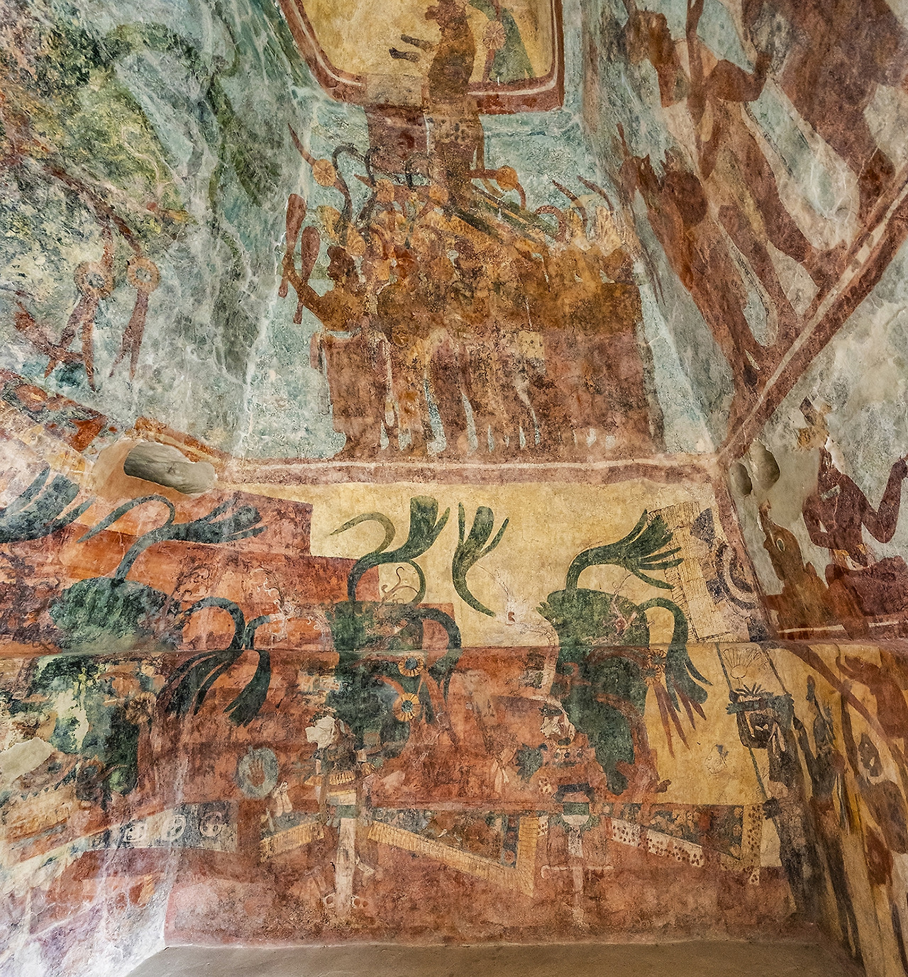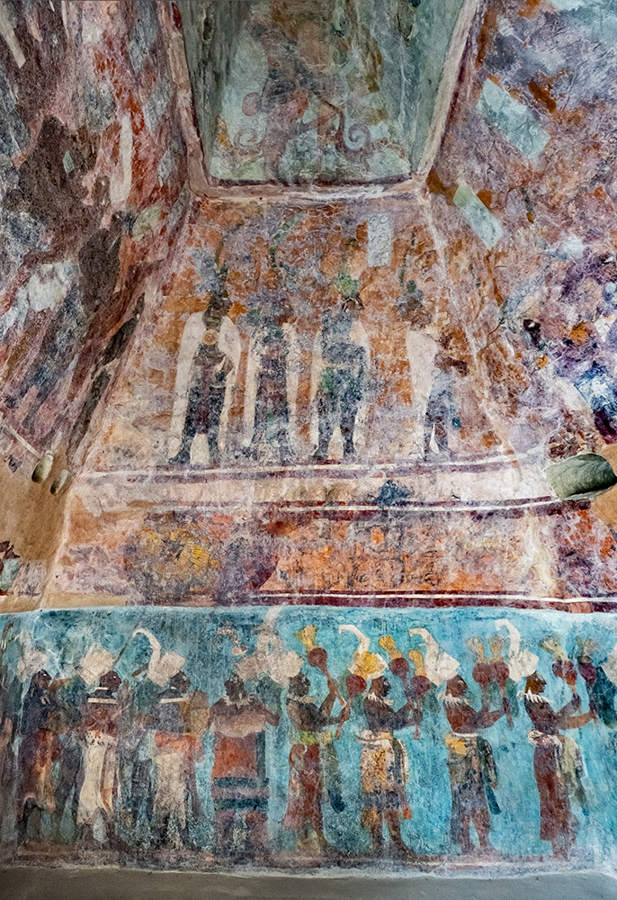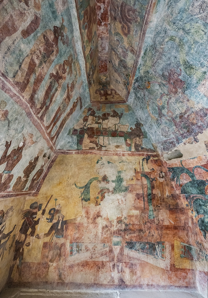 벽화가 있는 건물은 유적 내의 1호 건물이다. 이 건물은 내부의 뛰어난 벽화로 인해 그림의 신전이라 부르기도 한다. 791년 11월 11일에 왕에게 바친 건물이라 하니 무려 천 이백 수십 년이 흘렀다. 이 그림의 사원은 20세기 초에 미국의 사진가가 미국 학계에 소개함으로써 알려지게 되었지만 그 당시에도 마야 원주민들이 건물 안에서 의식을 치루고 있었다고 하니 이 유적은 외부세계에 알려지기 전에도 계속해서 신전으로서의 기능을 하고 있었다고 보아야 할 것이다.