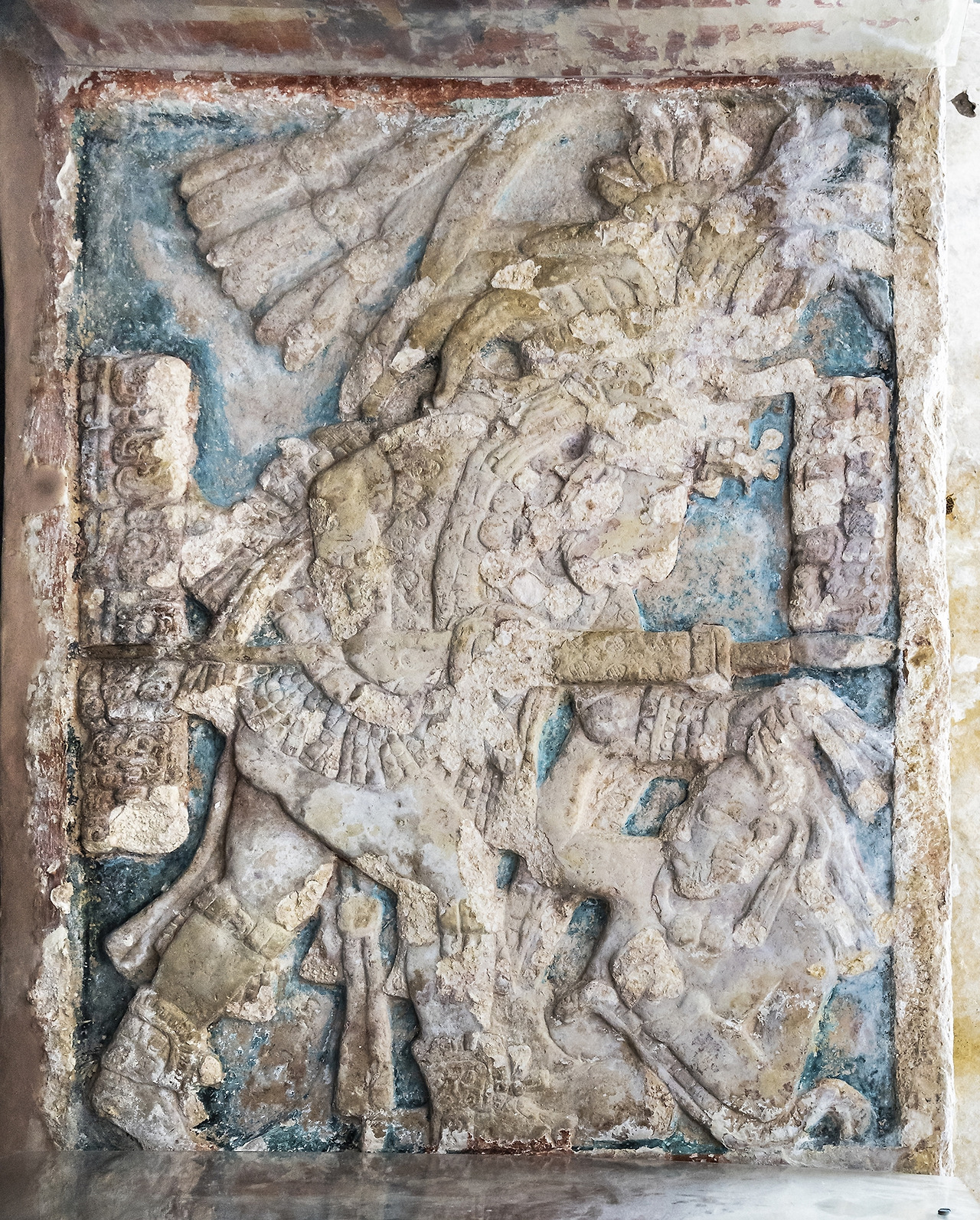1호 석실로 들어가는 문의 상인방에는 보남팍의 왕 찬무완 2세가 적군을 잡는 모습을 묘사한 그림이 새겨져 있다. 또 문의 양옆 벽면에도 채색 벽화가 있었는데 지금은 맨 위에만 조금 남아있다. 1호실 문을 들어서면 방안의 네 벽과 천장까지 원색의 그림들이 가득 차 있는 것에 놀라게 된다.