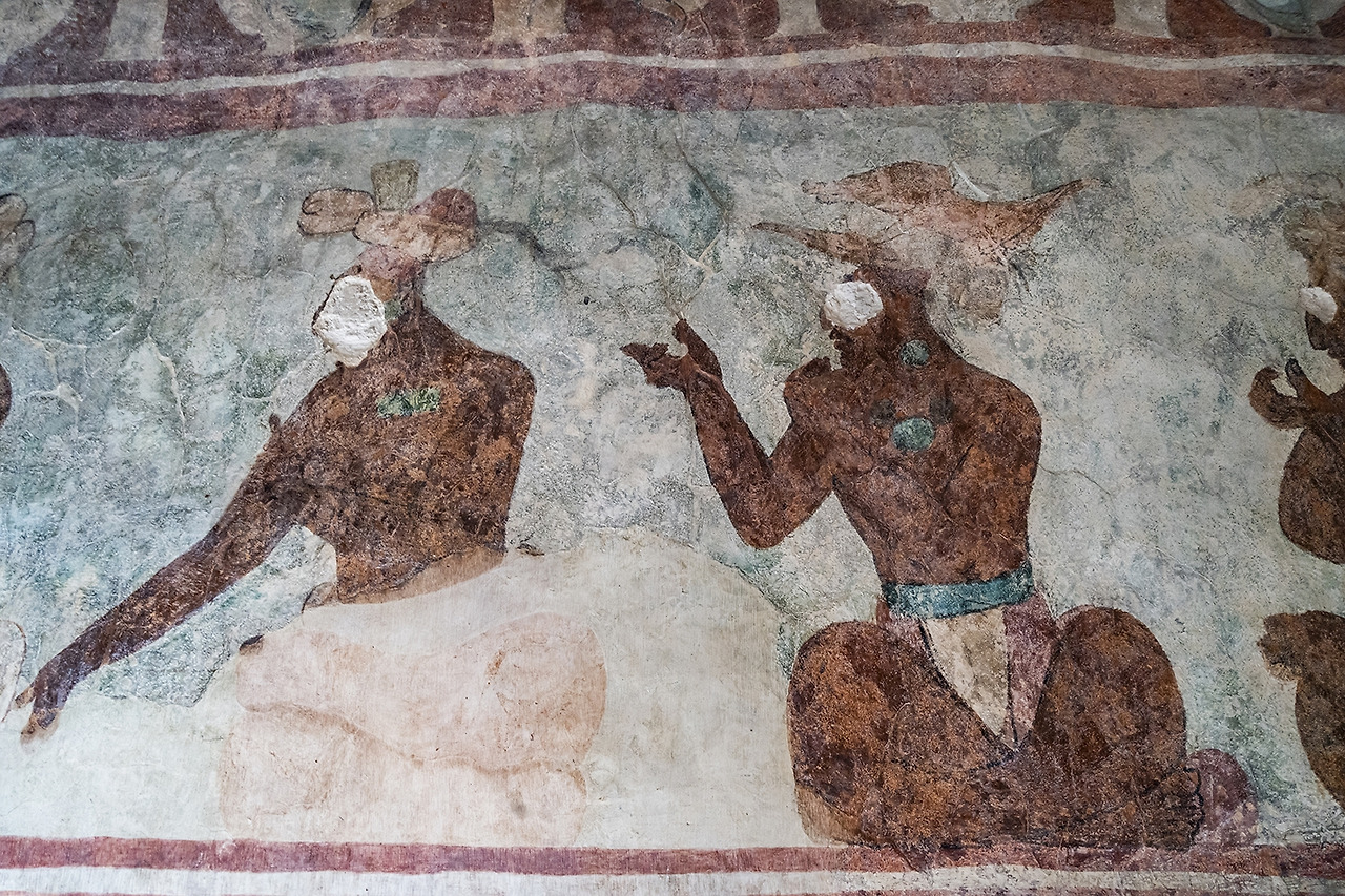 1호 석실 남벽. 하층에는 세 명의 왕족이 케찰 춤을 추고 있고 상층에는 다른 왕궁의 사신들이 이야기를 나누는 장면이라 한다. 오른쪽 단상에 안겨 있는 아기가 왕의 후계자라 한다.