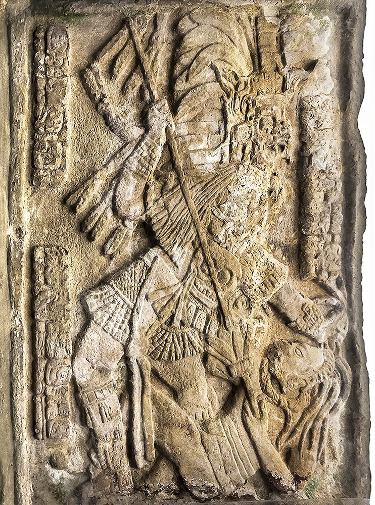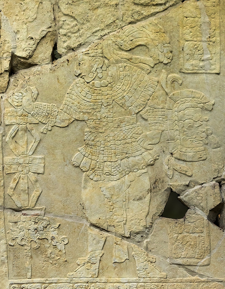 화려한 의상을 입고 의식용 지팡이를 짚고 있는 찬무안 2세. 등 쪽의 사각형 틀에 새겨진 것이 마야 문자로 새긴 기록이다.