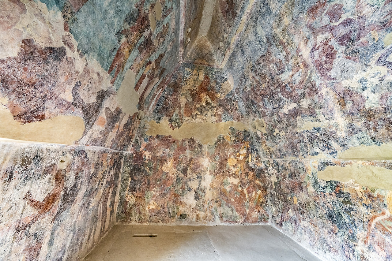 방의 구조는 장방형으로 벽의 상부는 대각선으로 안으로 좁혀져 좁은 천장을 만들고 있다. 벽에 그린 그림들은 회칠을 한 위에 채색화를 그린 소위 프레스코 벽화이다.