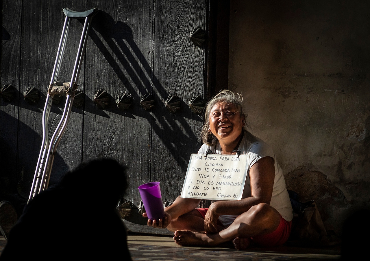 성당의 정문 안 쪽, 해가 잘 드는 곳에 나이 많은 맹인 여성이 목에 글이 쓰인 판지를 걸고 한 손에 동전용 큰 컵을 들고 나를 향해 웃고 있었다.