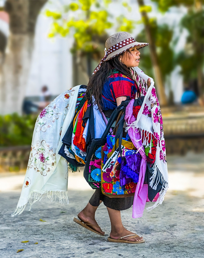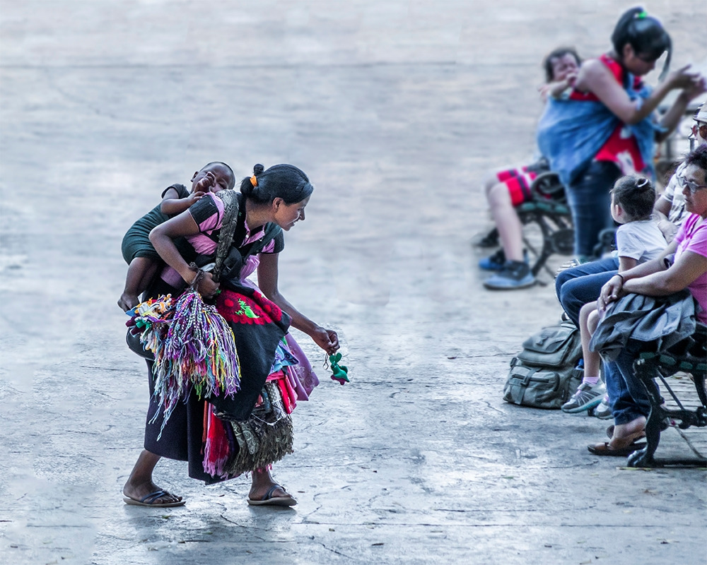 아기를 등에 업은 기념품 파는 여인이 관광 온 엄마에게 안겨 있는 아이에게 장난감을 권해보지만 아이는 딴전만 피고 있다. 등에 업힌 아기의 피곤한 하루가 시작되었다.