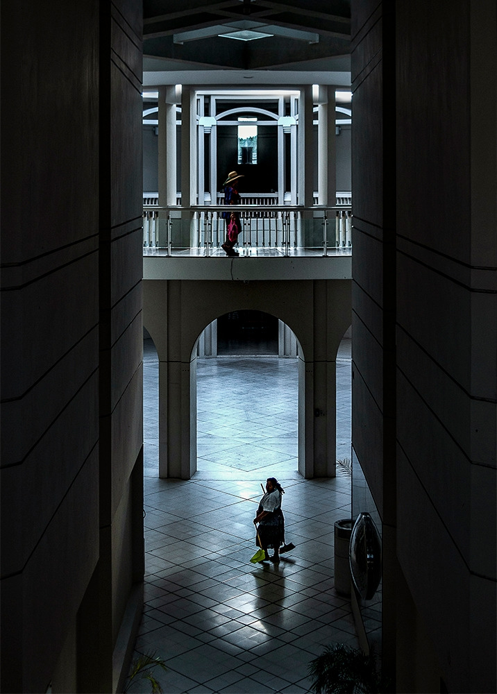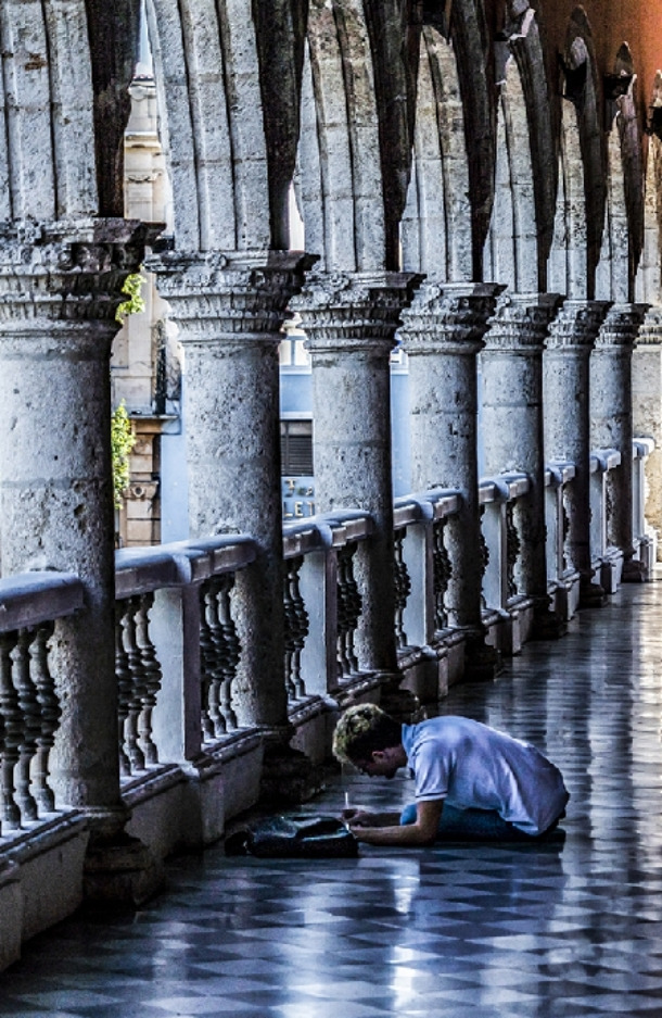 2층의 복도에서 무언가를 쓰고 있는 청년 여행자. 청년 .뒤쪽으로 시청 사무실이 있다.