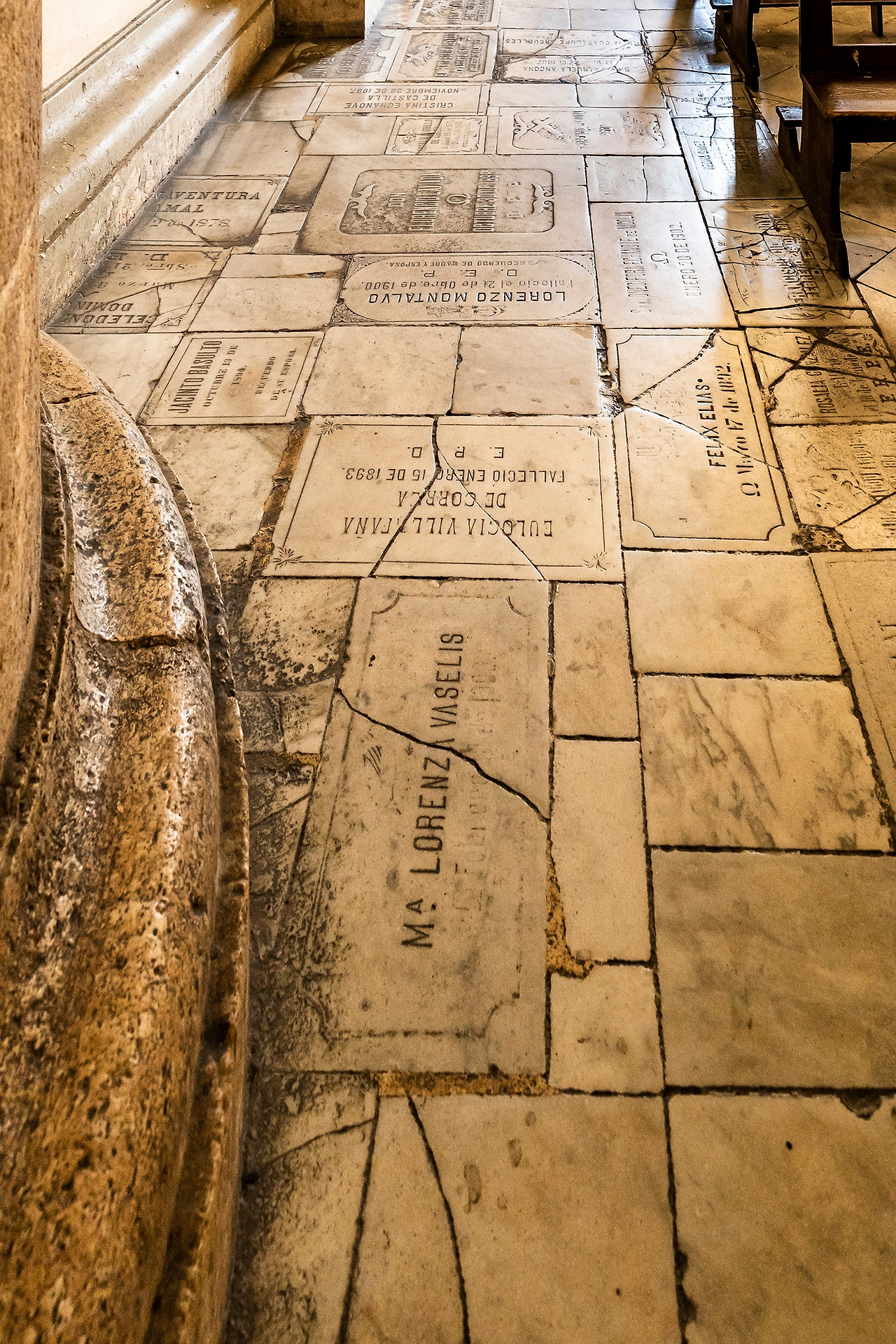 그 동판 외에도 성당 내부의 벽 쪽 바닥에는 글자가 새겨진 대리석판들이 많이 깔려 있다. 대부분 성당 내의 공동묘지에 사용된 표석들이다. 성당의 공동묘지들은 마치 아파트처럼 여러 층으로 칸을 만들고 그 속에 관을 안치하는데 입구를 이름과 죽은 연도를 새긴 표석으로 막는다.