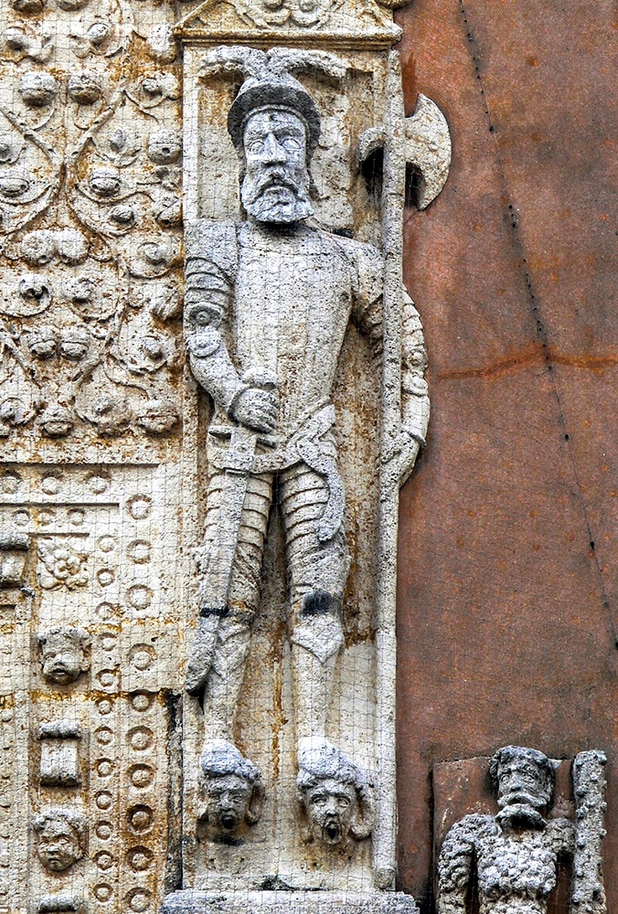 몬테호 저택의 정면 파사드. 2층 발코니 위의 중심에 가문의 문장이 있고 그 양쪽으로 칼과 도끼를 든 병사 두 명이 문지기처럼 서 있다.