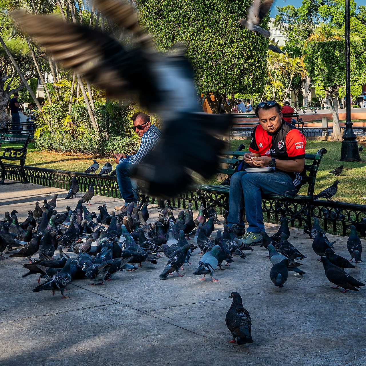 아침 산책을 나온 시민이 비둘기들에게 모이를 주고 있다.
