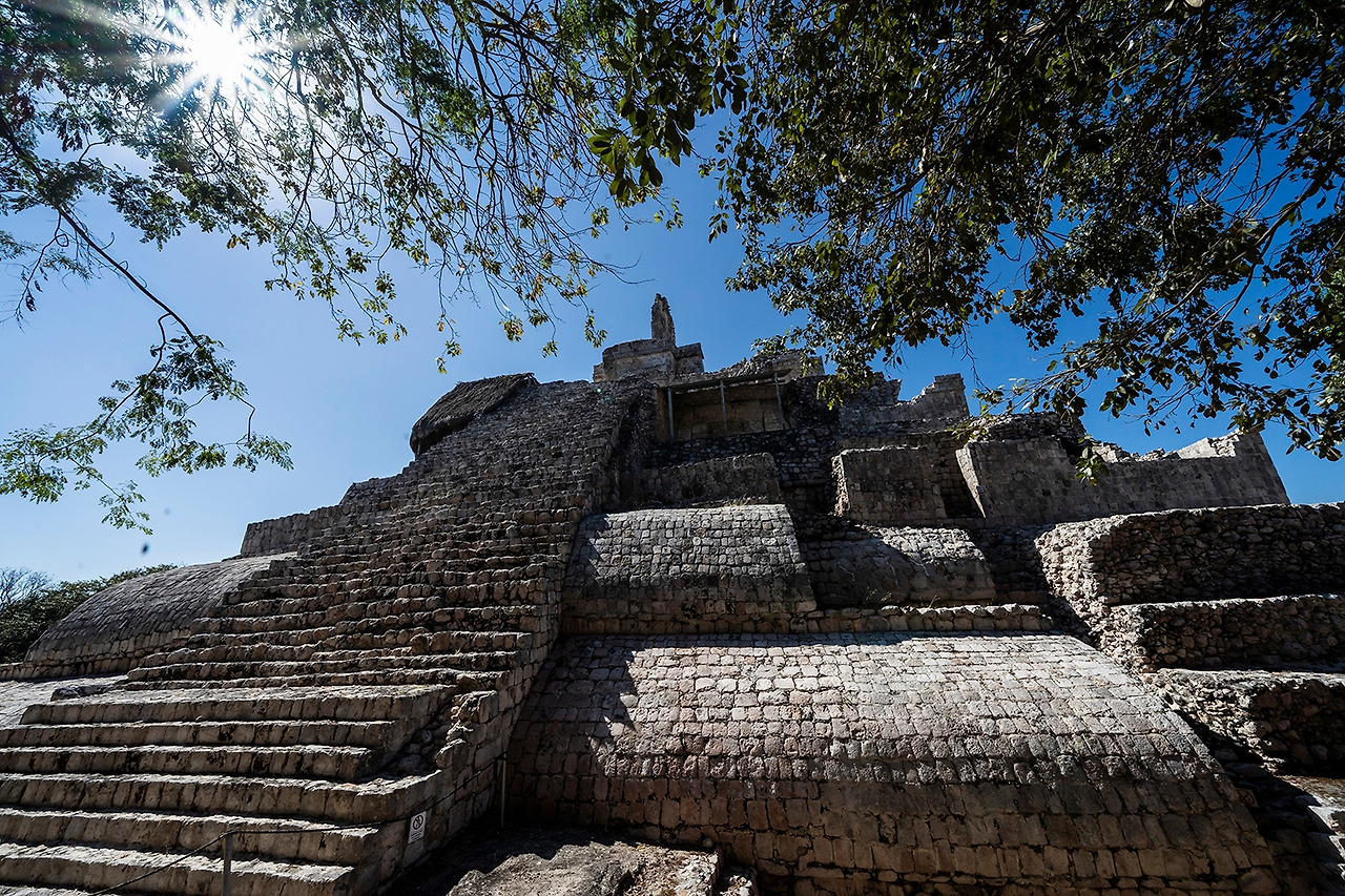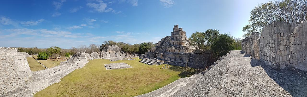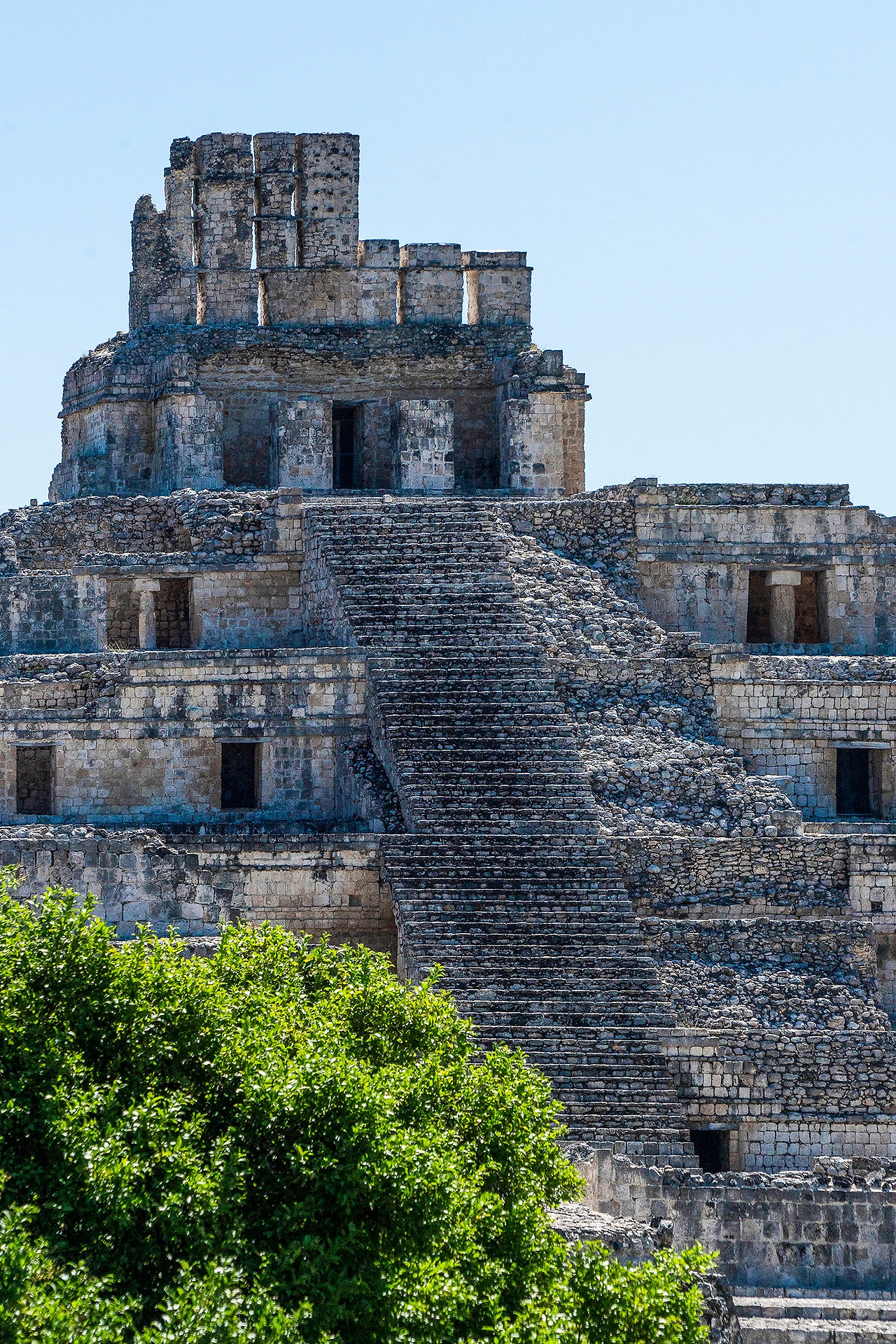 보수된 피라미드 뒤로 5층 피라미드 신전의 루프콤이 보인다.
