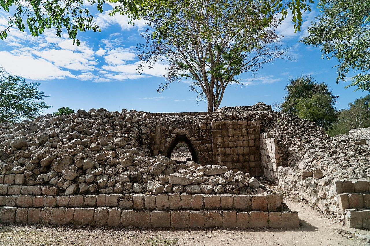 뒤에 있는 피라미드 신전은 계단을 쌓은 석축이 무너져 일부 만 원형을 살려 복원되었고 중앙 계단도 계단석들이 제 모습을 갖추지 못하였다.