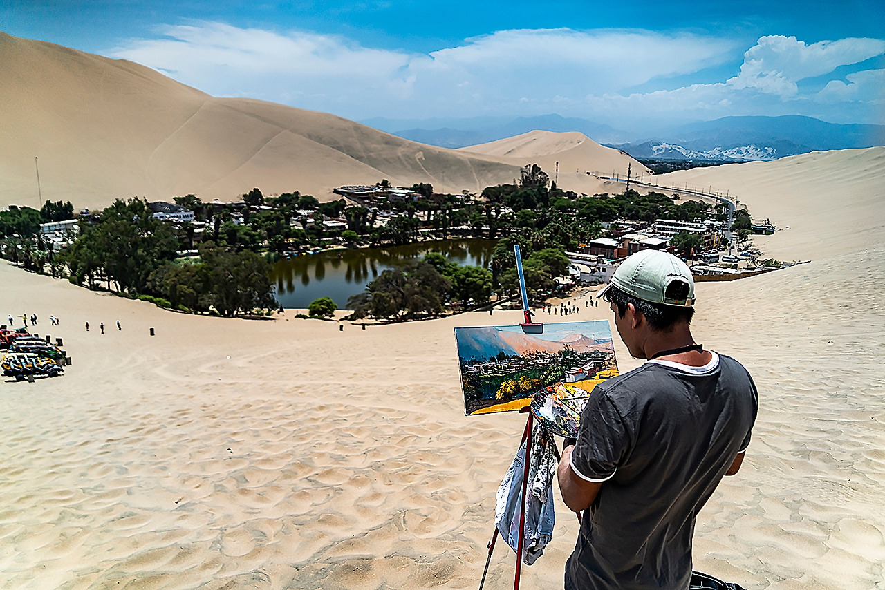 호숫가를 천천히 걷다 보면 이런 호수의 고요를 즐기는 사람들이 생각보다 많이 있었는데 그중에는 아름다운 호수의 풍경을 그리는 화가들이 여기저기 섞여 있었다. 오아시스의 아름다운 풍경은 그렇게 한낮의 평온함 속에서 유지되다가 다시 저녁이 되면 버기카들도 돌아오고 사람들도 호숫가로 쏟아져 나왔다. 웃음소리와 술잔 부딪는 소리들로 오아시스는 다시 활기를 찾았다.
