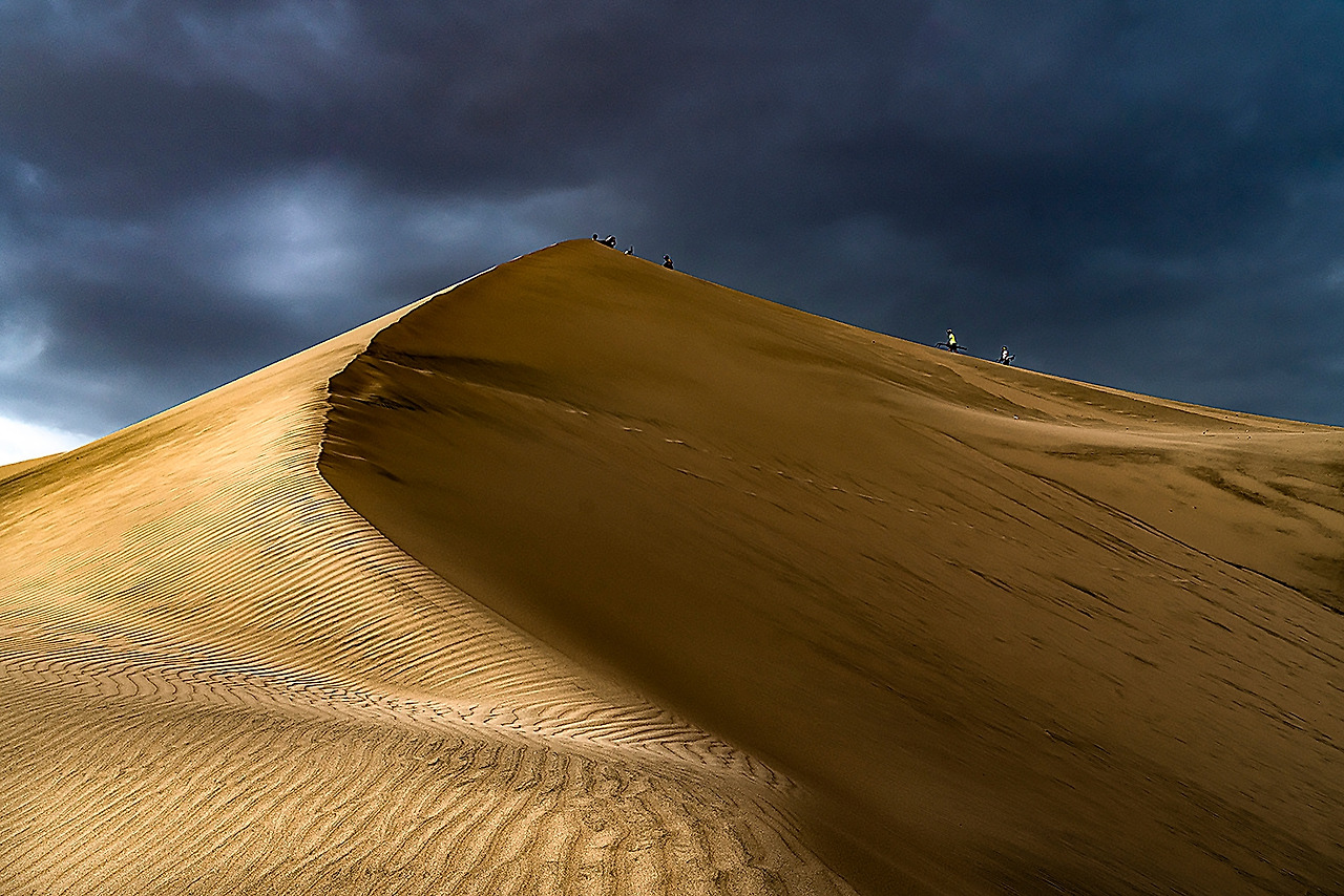 그래도 오아시스 물 가에서 모래언덕을 올려다보면 황금색으로 빛나는 모래톱이 우아한 곡선을 그리며 햇볕에 빛나고 있었다. 모래 능선이 하늘과 만나는 날카로운 선 위에 젊은이들이 샌드보드를 들고 정상으로 오르는 모습이 환상적이라 할 만큼 아름다웠다.
