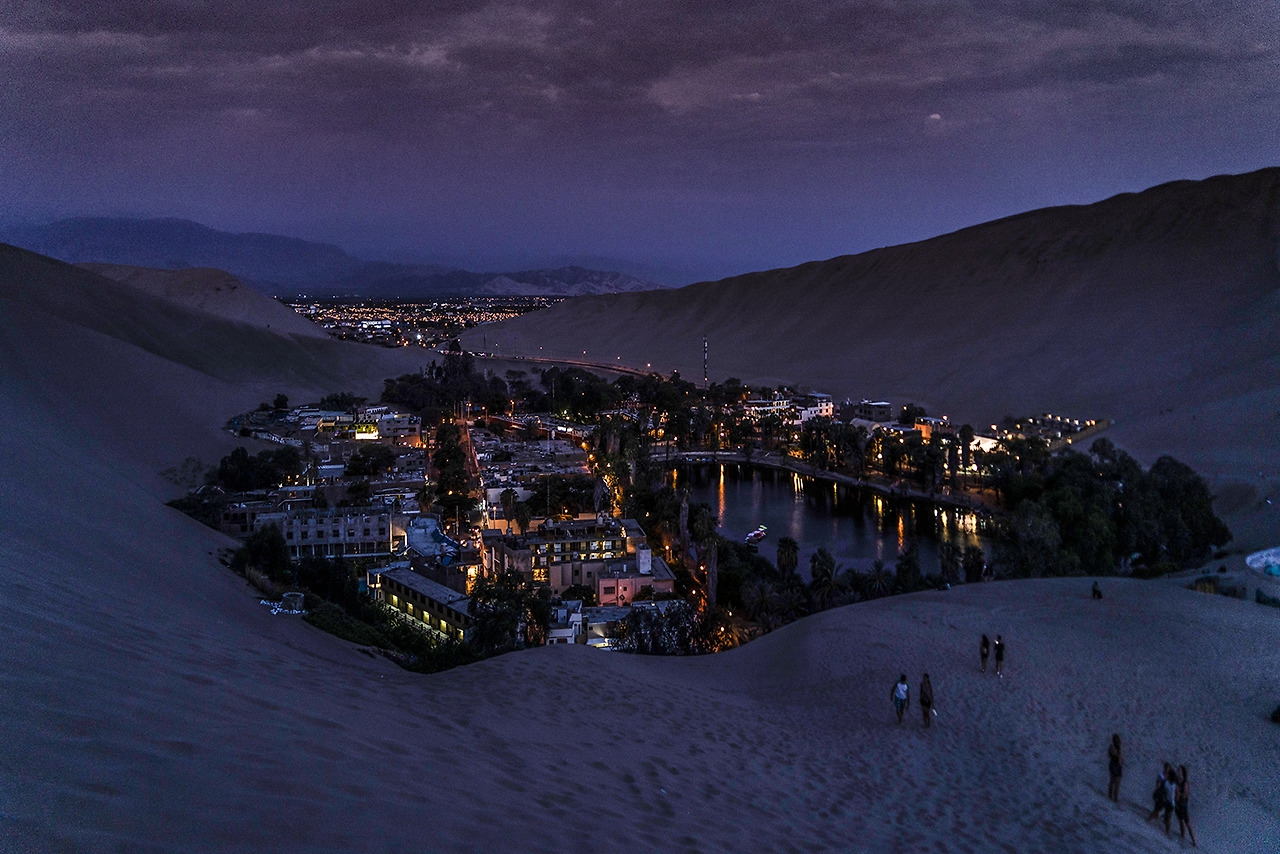해 진 뒤의 오아시스 풍경. 멀리 오아시스와 연결된 이카시의 불빛이 보인다.