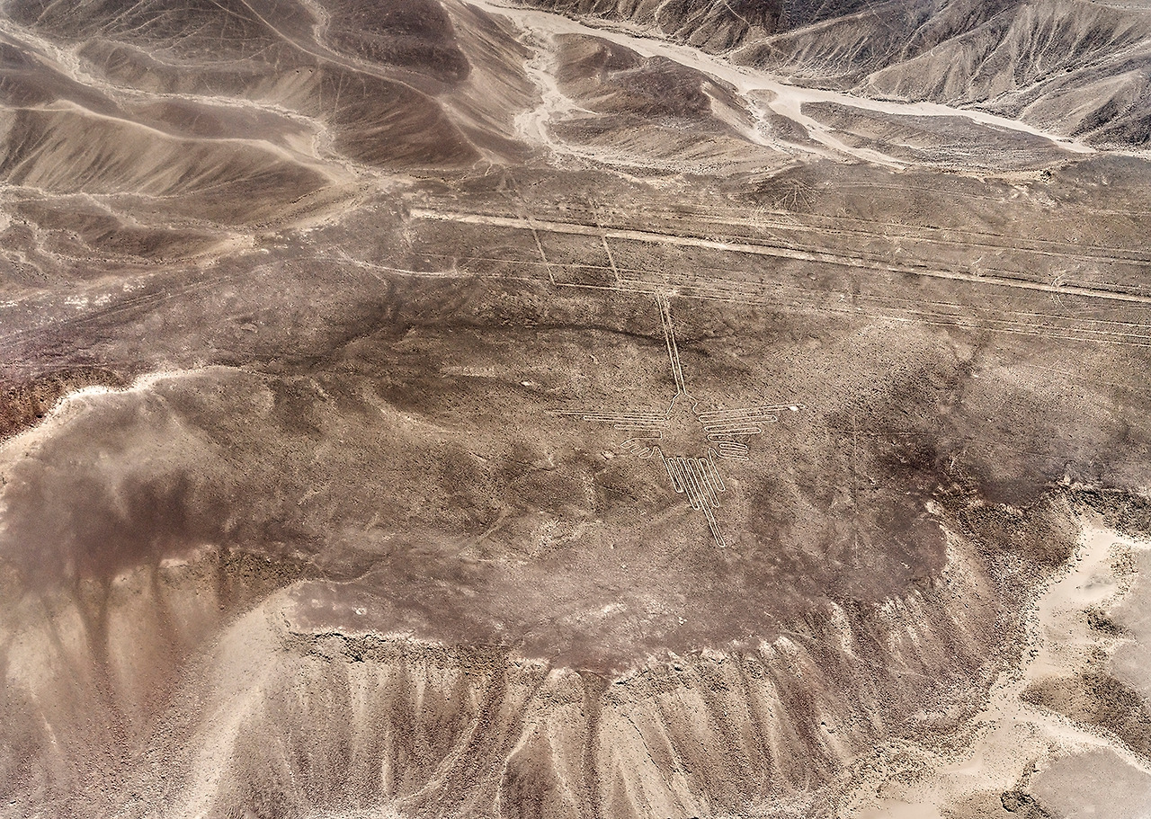 나스카 평원은 여느 사막과 달리 뒤의 산지에서 흘러 나스카 강으로 흘러드는 수많은 물줄기의 자국들이 가득하다. 물줄기의 흔적들은 마치 실핏줄처럼 보이는데 그 실핏줄을 통하여 먼 옛날 이 평원에 물을 공급했을 것으로 생각된다.