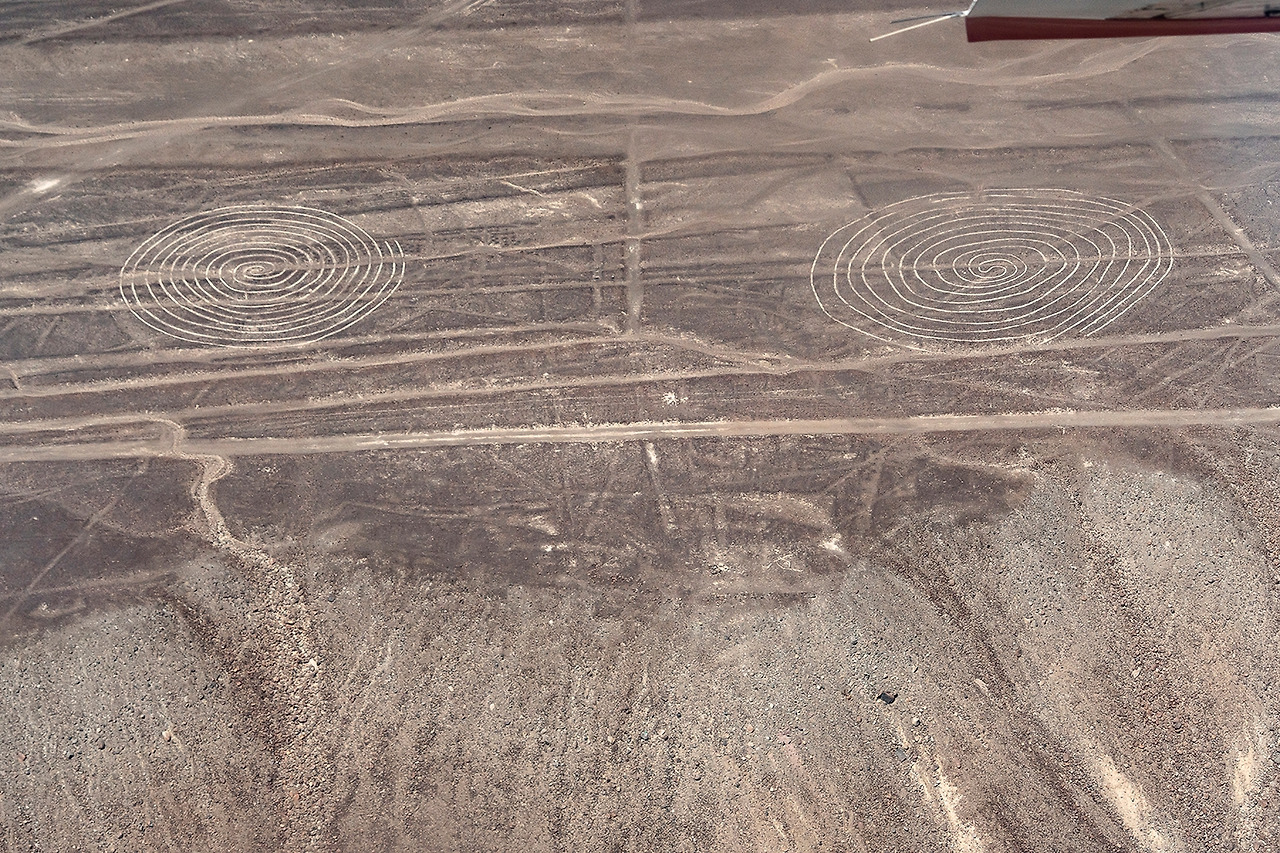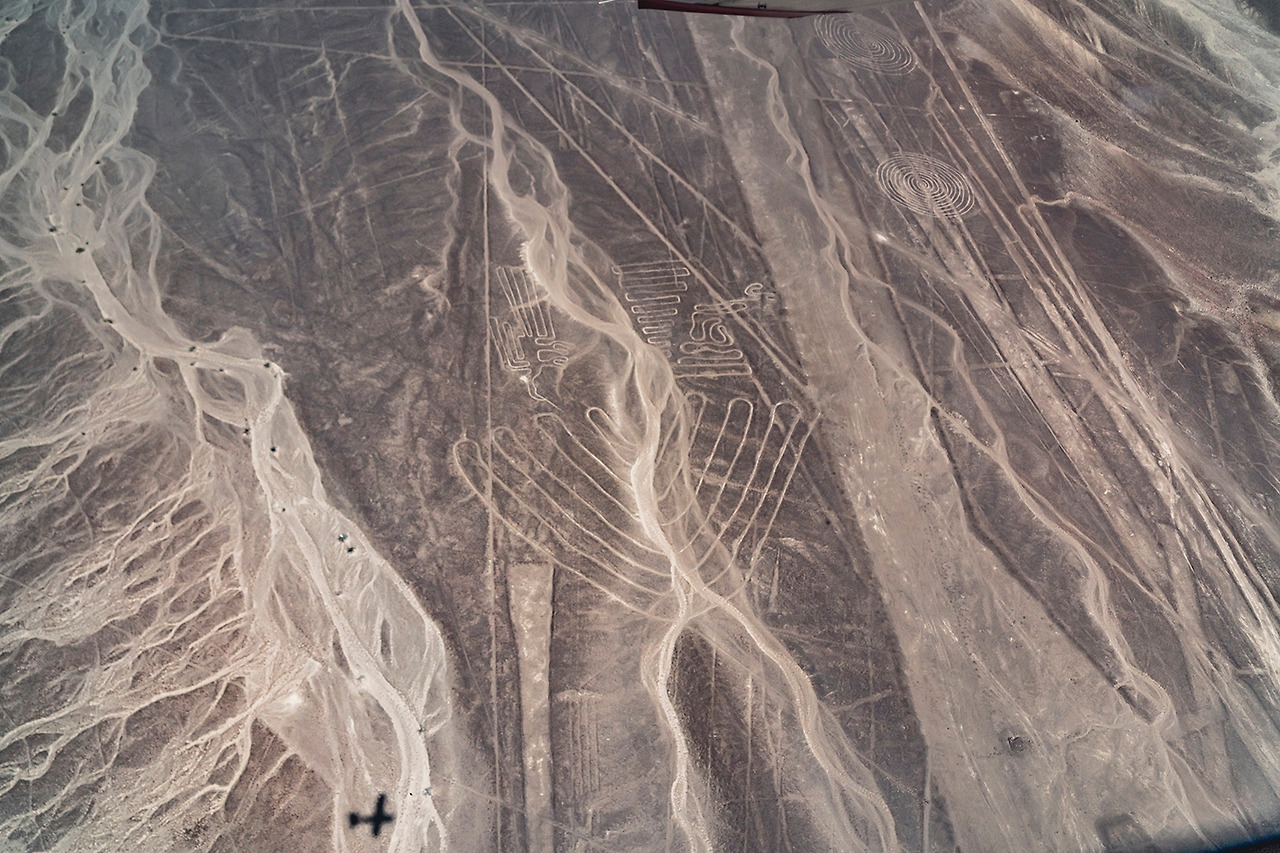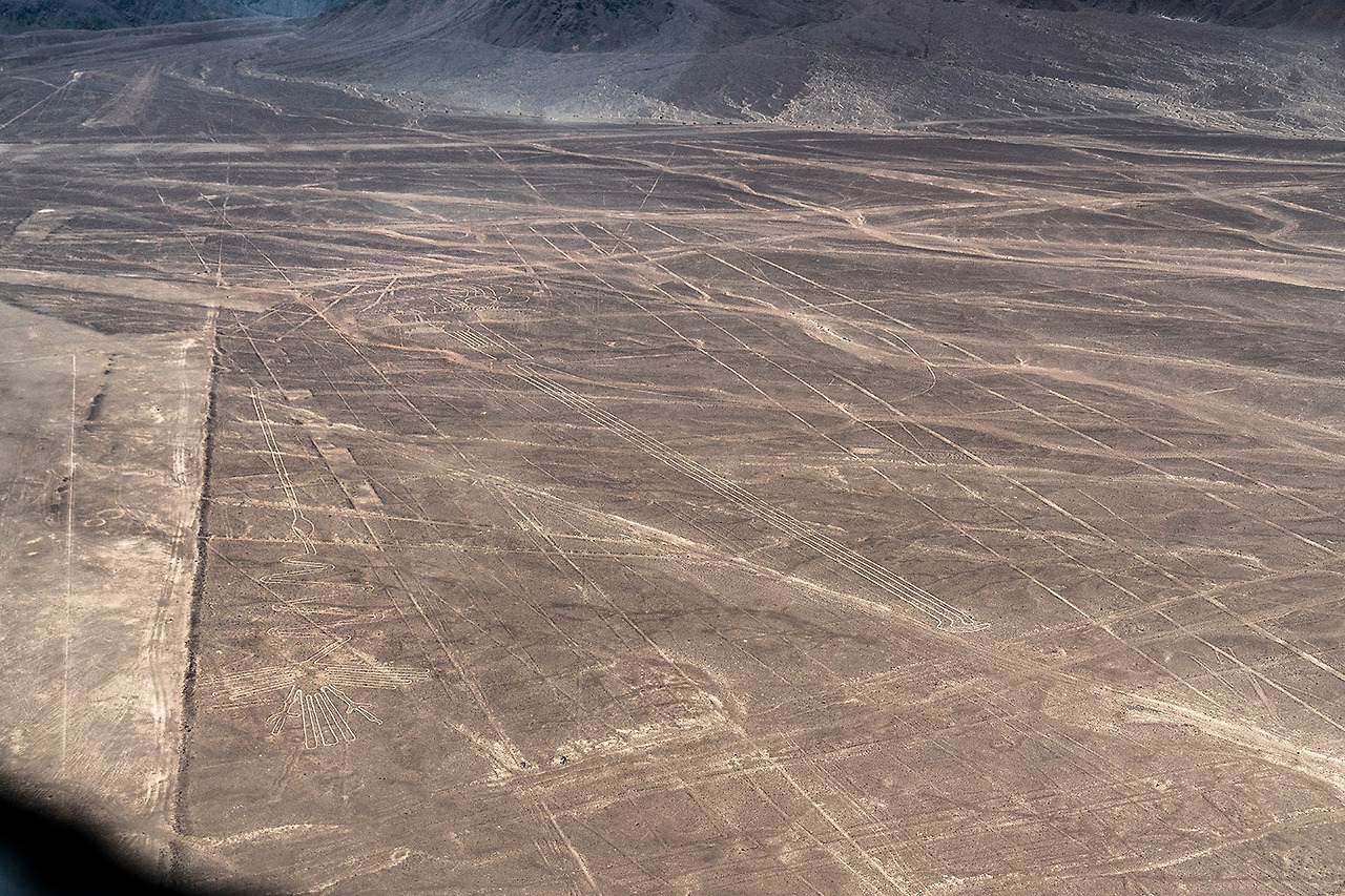 물줄기들 사이사이에 넓은 폭의 길고 긴 선들이 뻗어 있다. 우주인들의 착륙장소일 것이라는 설까지 있을 정도로 사람의 짓으로는 도저히 생각할 수 없을 정도의 규모로 보인다. 비행기에서 이 선들을 내려다보면서 정말 이것은 외계인들의 착륙지일 것이라는 생각을 품지 않을 수 없었다.