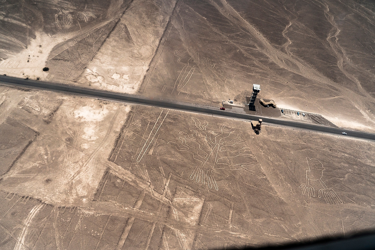 사람들이 오가기 편하려면 도로가 나는 것은 당연하다. 이 땅그림이 있는 평원에 판 아메리카나 하이웨이가 건설되었다. 지금 나스카 전망대가 서 있는 근처에 180미터에 이르는 도마뱀의 꼬리가 고속도로에 잘려 나갔다.