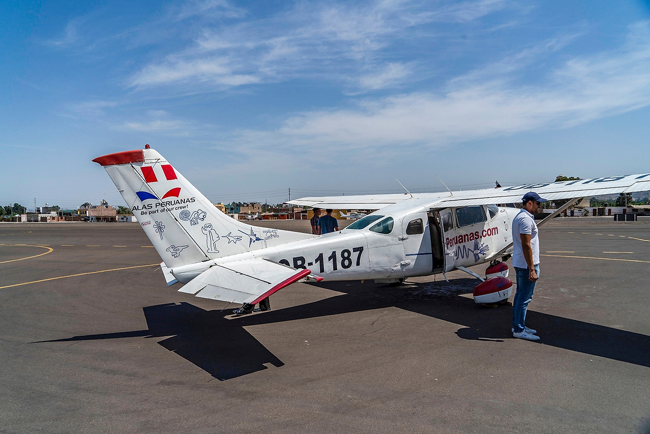마리아 라이헤 노이만 공항에 서있는 페루아나스 항공의 6인승 세스나기. 이 비행기로 한 시간에 걸쳐 나스카와 팔파 땅그림을 볼 수 있었다.