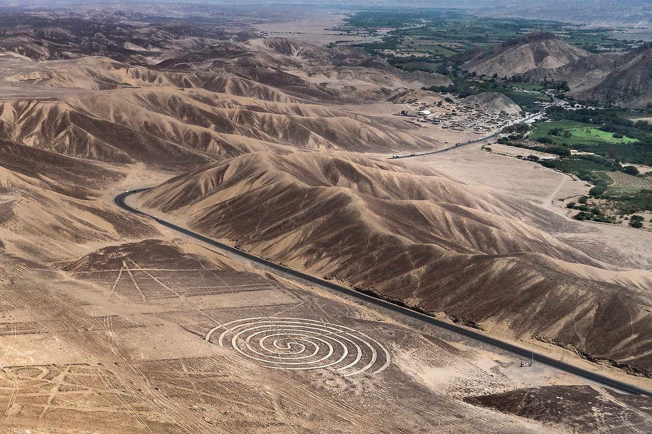 나스카 평원의 선 그림과 판 아메리카나 하이웨이. 위쪽 마을이 마리아 라이헤가 살던 카세 라 파스카나 마을이다.