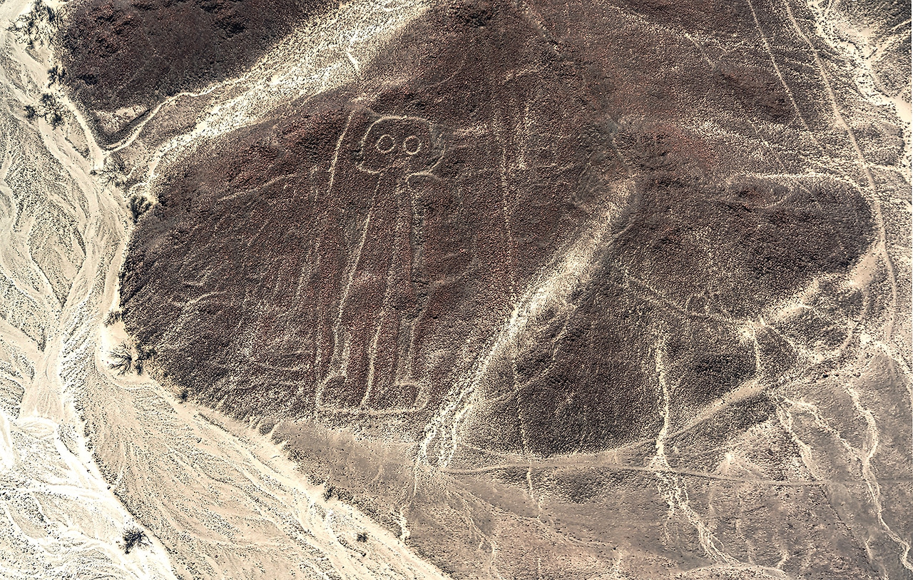 나스카 평원으로 들어온 지 얼마 안 되어 외계인 설을 증거 하듯이 하나의 인물상이 나타났다. 이 인물은 산의 경사면에 서 있는 듯 묘사되어 있다. 인물상은 동근 헬멧을 쓴 것 같은 머리에 안경을 쓴 듯한 동그란 두 개의 원으로 표현된 눈을 가졌다. 또 상체와 하체가 하나로 연결되어 있고 오른팔을 머리 위로 올리고 있다. 이는 어떻게 보면 우주비행사의 옷차림과 비슷하기도 하다. 이로 인해 흥밋거리를 좋아하는 사람들이 이 인물을 우주인이라 말하기도 한다.