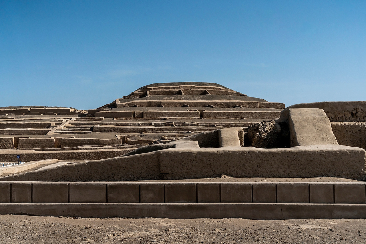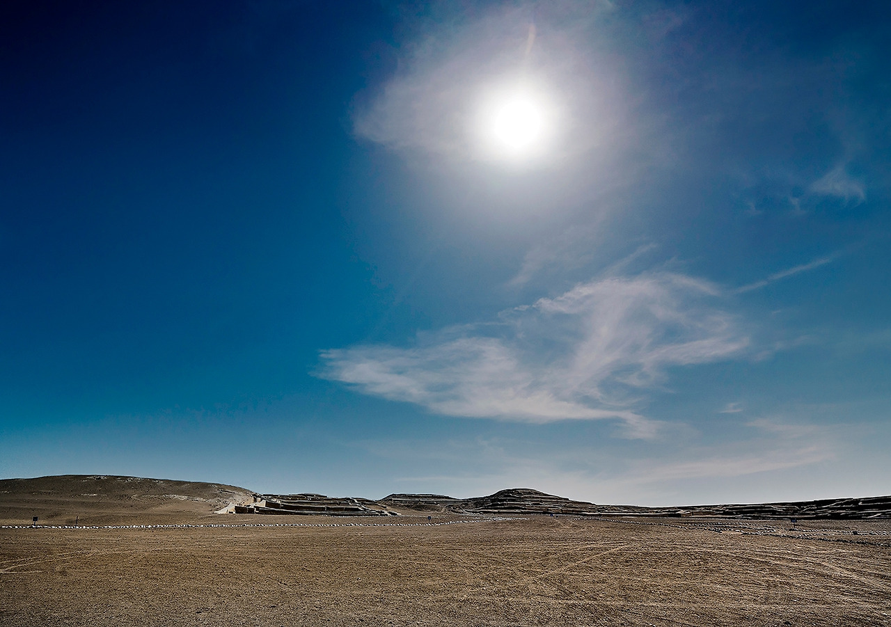 나스카 강의 남쪽 모래 언덕에 조성된 카우아치 피라미드 유적. 유적의 뒤쪽으로 넓은 평원이 펼쳐져 있으며 피라미드를 비롯한 많은 건축 유적들이 있다.
