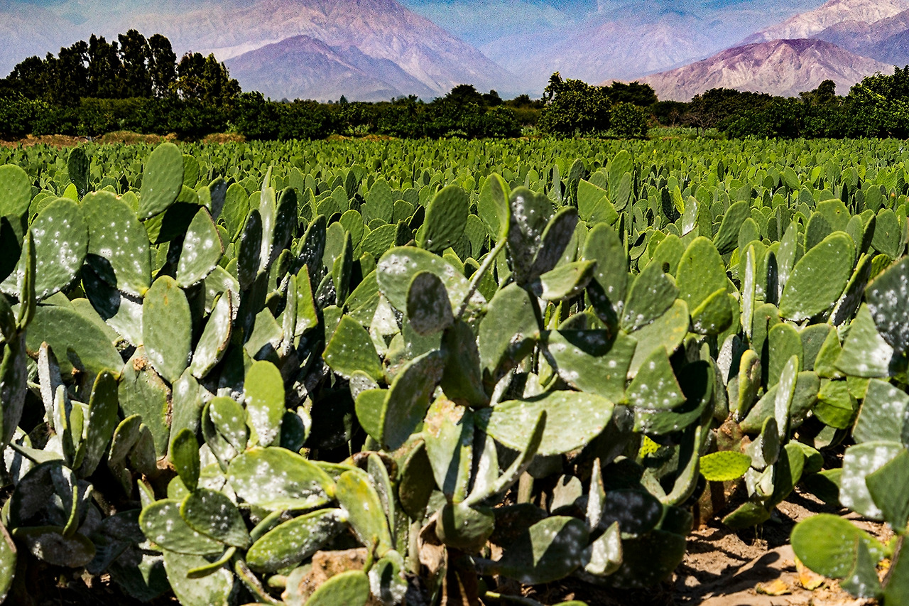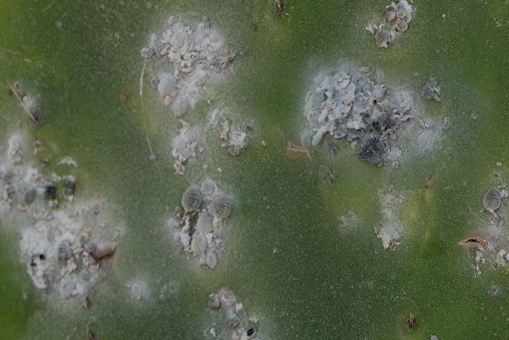 선인장에 기생하는 벌레 코치닐. 코치닐은 우리말로 연지벌레라고 하며 붉은색 염료의 원료로 사용한다.