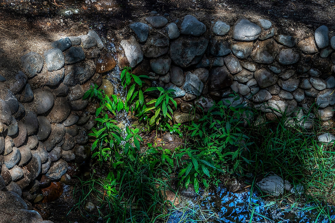 아케둑토 한쪽 석축 사이에서 지하수가 흘러내린다.
