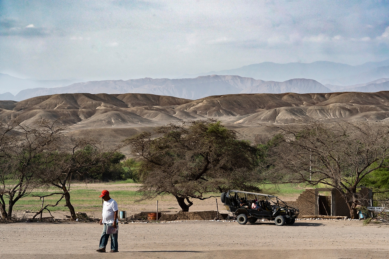 유적의 앞에는 와랑고 나무가 울창한 나스카 강이 흐르고 그 뒤로 땅그림이 있는 나스카 평원이 시작되는 능선이 보인다.