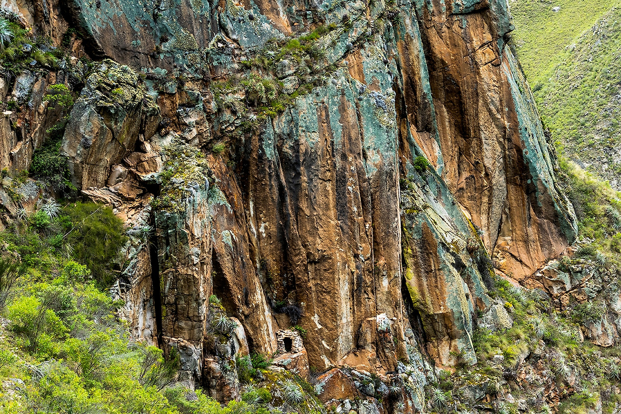절벽 밑에 조그마한 돌 구조물이 보인다. 잉카인의 기도처인가? 구조물의 배경으로 서있는 기둥모양 암석 절벽이 추상 설치미술처럼 보인다.